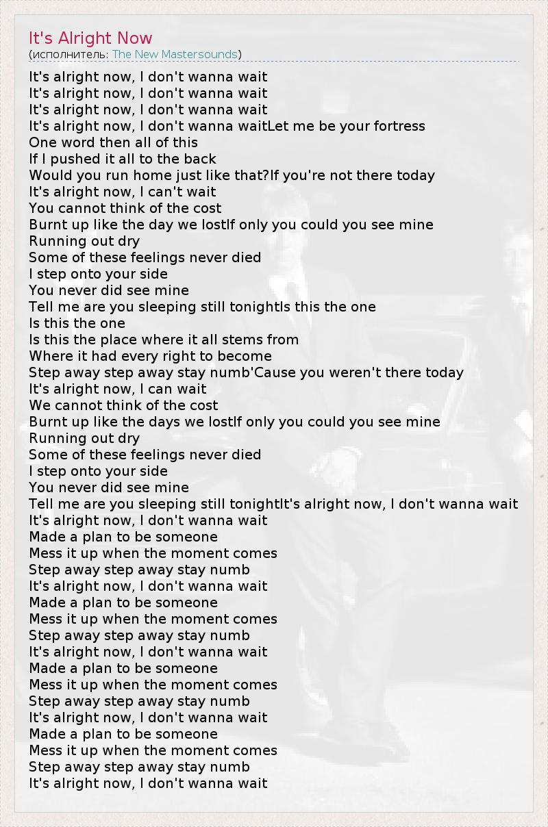 It's alright now, I don't wanna wait It's alright now, I don't wanna wait It's alright now, I don't wanna wait It's alright now, I don't wanna waitLet me be your fortress One word then all of this If I pushed it all to the back Would you run home just like that?If you're not there today It's alright now, I can't wait You cannot think of the cost Burnt up like the day we lostIf only you could you see mine Running out dry Some of these feelings never died I step onto your side You never did see mine Tell me are you sleeping still tonightIs this the one Is this the one Is this the place where it all stems from Where it had every right to become Step away step away stay numb'Cause you weren't there today It's alright now, I can wait We cannot think of the cost Burnt up like the days we lostIf only you could you see mine Running out dry Some of these feelings never died I step onto your side You never did see mine Tell me are you sleeping still tonightIt's alright now, I don't wanna wait It's alright now, I don't wanna wait Made a plan to be someone Mess it up when the moment comes Step away step away stay numb It's alright now, I don't wanna wait Made a plan to be someone Mess it up when the moment comes Step away step away stay numb It's alright now, I don't wanna wait Made a plan to be someone Mess it up when the moment comes Step away step away stay numb It's alright now, I don't wanna wait Made a plan to be someone Mess it up when the moment comes Step away step away stay numb It's alright now, I don't wanna wait