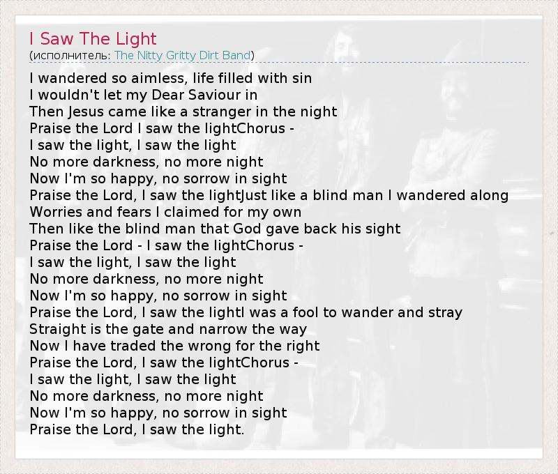 I wandered so aimless, life filled with sin I wouldn't let my Dear Saviour in Then Jesus came like a stranger in the night Praise the Lord I saw the lightChorus - I saw the light, I saw the light No more darkness, no more night Now I'm so happy, no sorrow in sight Praise the Lord, I saw the lightJust like a blind man I wandered along Worries and fears I claimed for my own Then like the blind man that God gave back his sight Praise the Lord - I saw the lightChorus - I saw the light, I saw the light No more darkness, no more night Now I'm so happy, no sorrow in sight Praise the Lord, I saw the lightI was a fool to wander and stray Straight is the gate and narrow the way Now I have traded the wrong for the right Praise the Lord, I saw the lightChorus - I saw the light, I saw the light No more darkness, no more night Now I'm so happy, no sorrow in sight Praise the Lord, I saw the light.