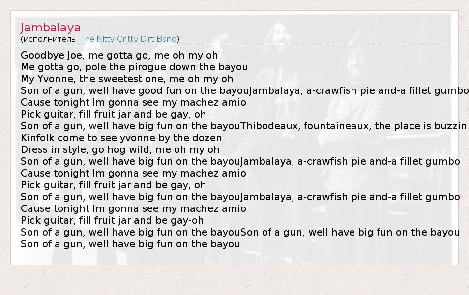 А как ты думаешь, о чем песня "Jambalaya" ?