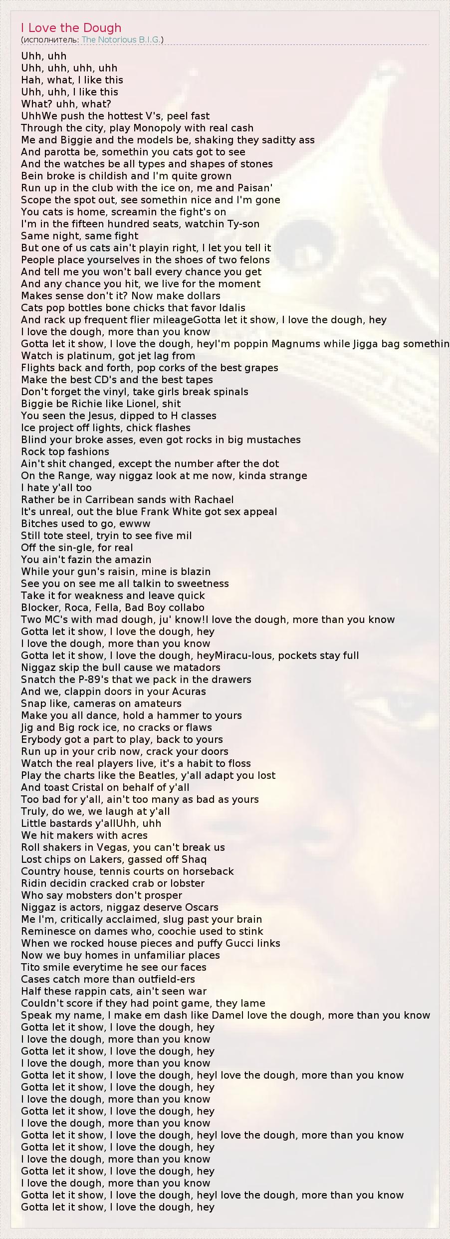 Uhh, uhh Uhh, uhh, uhh, uhh Hah, what, I like this Uhh, uhh, I like this What? uhh, what? UhhWe push the hottest V's, peel fast Through the city, play Monopoly with real cash Me and Biggie and the models be, shaking they saditty ass And parotta be, somethin you cats got to see And the watches be all types and shapes of stones Bein broke is childish and I'm quite grown Run up in the club with the ice on, me and Paisan' Scope the spot out, see somethin nice and I'm gone You cats is home, screamin the fight's on I'm in the fifteen hundred seats, watchin Ty-son Same night, same fight But one of us cats ain't playin right, I let you tell it People place yourselves in the shoes of two felons And tell me you won't ball every chance you get And any chance you hit, we live for the moment Makes sense don't it? Now make dollars Cats pop bottles bone chicks that favor Idalis And rack up frequent flier mileageGotta let it show, I love the dough, hey I love the dough, more than you know Gotta let it show, I love the dough, heyI'm poppin Magnums while Jigga bag somethin Watch is platinum, got jet lag from Flights back and forth, pop corks of the best grapes Make the best CD's and the best tapes Don't forget the vinyl, take girls break spinals Biggie be Richie like Lionel, shit You seen the Jesus, dipped to H classes Ice project off lights, chick flashes Blind your broke asses, even got rocks in big mustaches Rock top fashions Ain't shit changed, except the number after the dot On the Range, way niggaz look at me now, kinda strange I hate y'all too Rather be in Carribean sands with Rachael It's unreal, out the blue Frank White got sex appeal Bitches used to go, ewww Still tote steel, tryin to see five mil Off the sin-gle, for real You ain't fazin the amazin While your gun's raisin, mine is blazin See you on see me all talkin to sweetness Take it for weakness and leave quick Blocker, Roca, Fella, Bad Boy collabo Two MC's with mad dough, ju' know!I love the dough, more than you know Gotta let it show, I love the dough, hey I love the dough, more than you know Gotta let it show, I love the dough, heyMiracu-lous, pockets stay full Niggaz skip the bull cause we matadors Snatch the P-89's that we pack in the drawers And we, clappin doors in your Acuras Snap like, cameras on amateurs Make you all dance, hold a hammer to yours Jig and Big rock ice, no cracks or flaws Erybody got a part to play, back to yours Run up in your crib now, crack your doors Watch the real players live, it's a habit to floss Play the charts like the Beatles, y'all adapt you lost And toast Cristal on behalf of y'all Too bad for y'all, ain't too many as bad as yours Truly, do we, we laugh at y'all Little bastards y'allUhh, uhh We hit makers with acres Roll shakers in Vegas, you can't break us Lost chips on Lakers, gassed off Shaq Country house, tennis courts on horseback Ridin decidin cracked crab or lobster Who say mobsters don't prosper Niggaz is actors, niggaz deserve Oscars Me I'm, critically acclaimed, slug past your brain Reminesce on dames who, coochie used to stink When we rocked house pieces and puffy Gucci links Now we buy homes in unfamiliar places Tito smile everytime he see our faces Cases catch more than outfield-ers Half these rappin cats, ain't seen war Couldn't score if they had point game, they lame Speak my name, I make em dash like DameI love the dough, more than you know Gotta let it show, I love the dough, hey I love the dough, more than you know Gotta let it show, I love the dough, hey I love the dough, more than you know Gotta let it show, I love the dough, heyI love the dough, more than you know Gotta let it show, I love the dough, hey I love the dough, more than you know Gotta let it show, I love the dough, hey I love the dough, more than you know Gotta let it show, I love the dough, heyI love the dough, more than you know Gotta let it show, I love the dough, hey I love the dough, more than you know Gotta let it show, I love the dough, hey I love the dough, more than you know Gotta let it show, I love the dough, heyI love the dough, more than you know Gotta let it show, I love the dough, hey