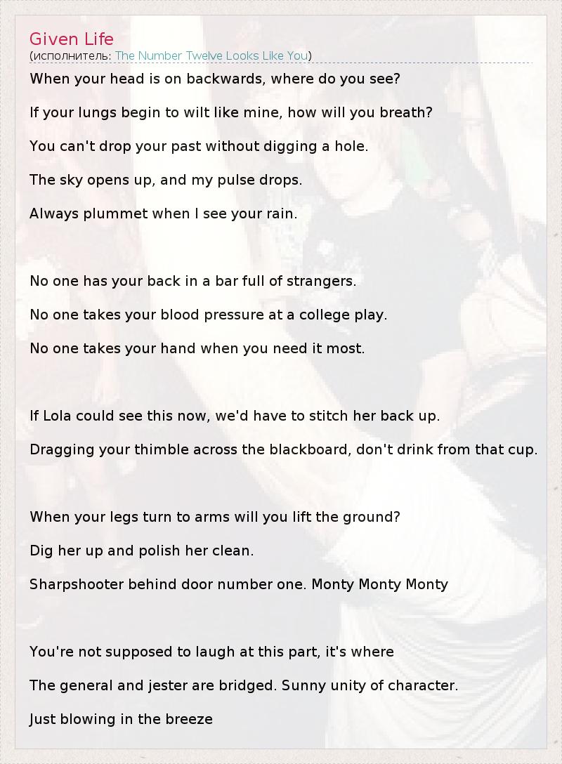Это интересно:Если вы спросите у каждого из шести участников этой банды о том, как была основана «The Number Twelve Looks Like You», вы услышите в ответ шесть разных историй. Хотя некоторые моменты историй всё-таки будут совпадать. Но один факт всё-таки подтверждён это то, что The Number Twelve Looks Like You банда была основана где-то в 2000 году в Нью-Джерси, США, где живут участники команды… The Number Twelve Looks Like You – это своеобразная... продолжение