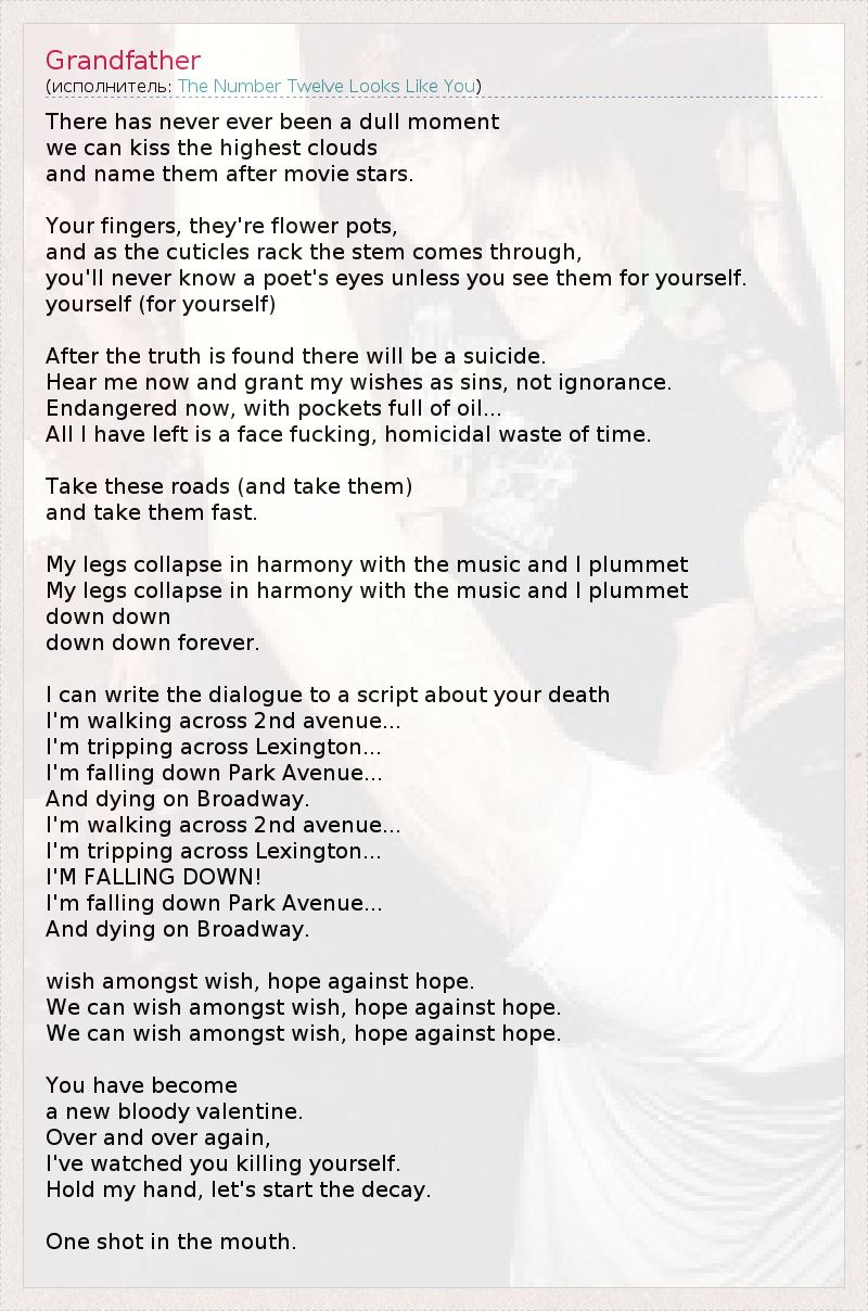 There has never ever been a dull moment we can kiss the highest clouds and name them after movie stars. Your fingers, they're flower pots, and as the cuticles rack the stem comes through, you'll never know a poet's eyes unless you see them for yourself. yourself (for yourself) After the truth is found there will be a suicide. Hear me now and grant my wishes as sins, not ignorance. Endangered now, with pockets full of oil... All I have left is a face fucking, homicidal waste of time. Take these roads (and take them) and take them fast. My legs collapse in harmony with the music and I plummet My legs collapse in harmony with the music and I plummet down down down down forever. I can write the dialogue to a script about your death I'm walking across 2nd avenue... I'm tripping across Lexington... I'm falling down Park Avenue... And dying on Broadway. I'm walking across 2nd avenue... I'm tripping across Lexington... I'M FALLING DOWN! I'm falling down Park Avenue... And dying on Broadway. wish amongst wish, hope against hope. We can wish amongst wish, hope against hope. We can wish amongst wish, hope against hope. You have become a new bloody valentine. Over and over again, I've watched you killing yourself. Hold my hand, let's start the decay. One shot in the mouth.