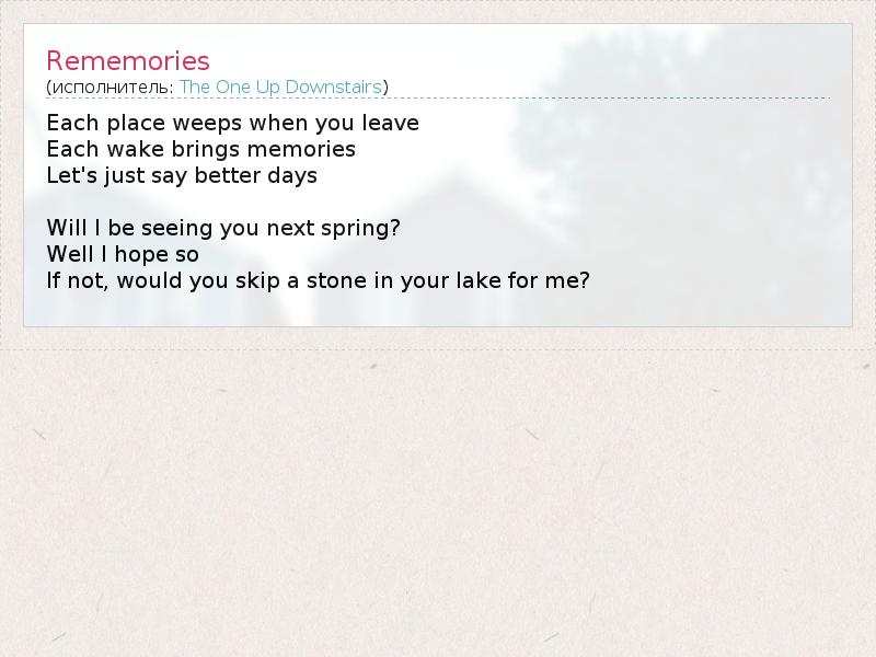 Each place weeps when you leave Each wake brings memories Let's just say better days Will I be seeing you next spring? Well I hope so If not, would you skip a stone in your lake for me?