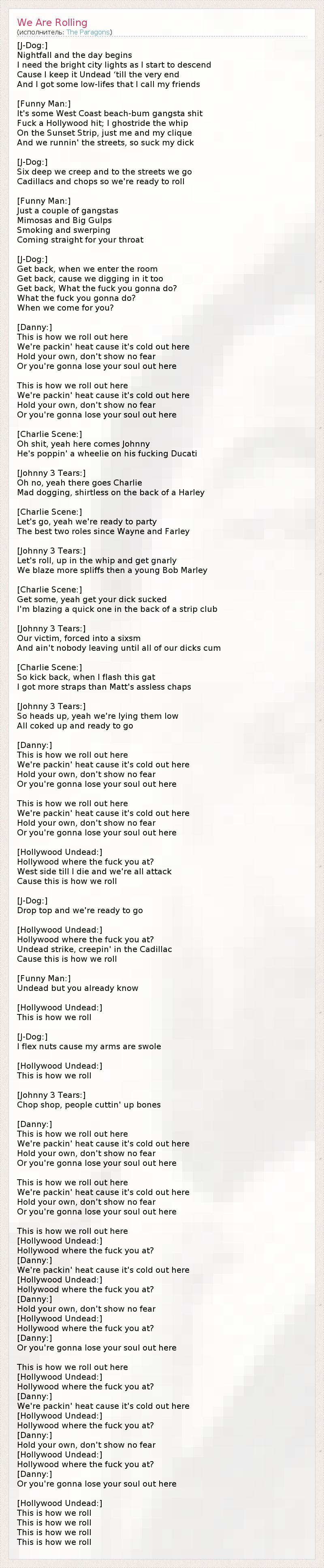 [J-Dog:] Nightfall and the day begins I need the bright city lights as I start to descend Cause I keep it Undead ‘till the very end And I got some low-lifes that I call my friends [Funny Man:] It's some West Coast beach-bum gangsta shit Fuck a Hollywood hit; I ghostride the whip On the Sunset Strip, just me and my clique And we runnin' the streets, so suck my dick [J-Dog:] Six deep we creep and to the streets we go Cadillacs and chops so we're ready to roll [Funny Man:] Just a couple of gangstas Mimosas and Big Gulps Smoking and swerping Coming straight for your throat [J-Dog:] Get back, when we enter the room Get back, cause we digging in it too Get back, What the fuck you gonna do? What the fuck you gonna do? When we come for you? [Danny:] This is how we roll out here We're packin' heat cause it's cold out here Hold your own, don't show no fear Or you're gonna lose your soul out here This is how we roll out here We're packin' heat cause it's cold out here Hold your own, don't show no fear Or you're gonna lose your soul out here [Charlie Scene:] Oh shit, yeah here comes Johnny He's poppin' a wheelie on his fucking Ducati [Johnny 3 Tears:] Oh no, yeah there goes Charlie Mad dogging, shirtless on the back of a Harley [Charlie Scene:] Let's go, yeah we're ready to party The best two roles since Wayne and Farley [Johnny 3 Tears:] Let's roll, up in the whip and get gnarly We blaze more spliffs then a young Bob Marley [Charlie Scene:] Get some, yeah get your dick sucked I'm blazing a quick one in the back of a strip club [Johnny 3 Tears:] Our victim, forced into a sixsm And ain't nobody leaving until all of our dicks cum [Charlie Scene:] So kick back, when I flash this gat I got more straps than Matt's assless chaps [Johnny 3 Tears:] So heads up, yeah we're lying them low All coked up and ready to go [Danny:] This is how we roll out here We're packin' heat cause it's cold out here Hold your own, don't show no fear Or you're gonna lose your soul out here This is how we roll out here We're packin' heat cause it's cold out here Hold your own, don't show no fear Or you're gonna lose your soul out here [Hollywood Undead:] Hollywood where the fuck you at? West side till I die and we're all attack Cause this is how we roll [J-Dog:] Drop top and we're ready to go [Hollywood Undead:] Hollywood where the fuck you at? Undead strike, creepin' in the Cadillac Cause this is how we roll [Funny Man:] Undead but you already know [Hollywood Undead:] This is how we roll [J-Dog:] I flex nuts cause my arms are swole [Hollywood Undead:] This is how we roll [Johnny 3 Tears:] Chop shop, people cuttin' up bones [Danny:] This is how we roll out here We're packin' heat cause it's cold out here Hold your own, don't show no fear Or you're gonna lose your soul out here This is how we roll out here We're packin' heat cause it's cold out here Hold your own, don't show no fear Or you're gonna lose your soul out here This is how we roll out here [Hollywood Undead:] Hollywood where the fuck you at? [Danny:] We're packin' heat cause it's cold out here [Hollywood Undead:] Hollywood where the fuck you at? [Danny:] Hold your own, don't show no fear [Hollywood Undead:] Hollywood where the fuck you at? [Danny:] Or you're gonna lose your soul out here This is how we roll out here [Hollywood Undead:] Hollywood where the fuck you at? [Danny:] We're packin' heat cause it's cold out here [Hollywood Undead:] Hollywood where the fuck you at? [Danny:] Hold your own, don't show no fear [Hollywood Undead:] Hollywood where the fuck you at? [Danny:] Or you're gonna lose your soul out here [Hollywood Undead:] This is how we roll This is how we roll This is how we roll This is how we roll
