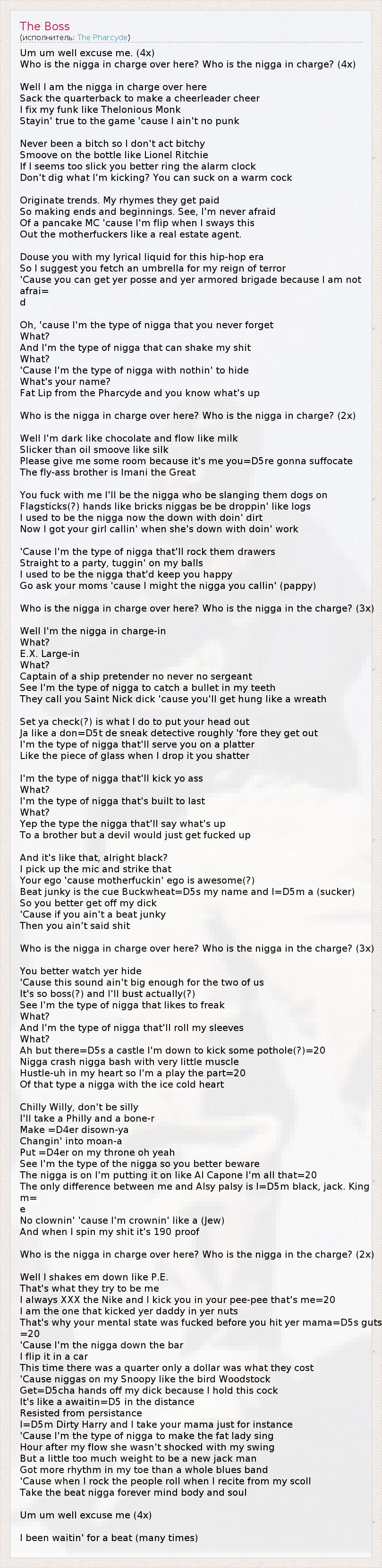 Um um well excuse me. (4x) Who is the nigga in charge over here? Who is the nigga in charge? (4x) Well I am the nigga in charge over here Sack the quarterback to make a cheerleader cheer I fix my funk like Thelonious Monk Stayin' true to the game 'cause I ain't no punk Never been a bitch so I don't act bitchy Smoove on the bottle like Lionel Ritchie If I seems too slick you better ring the alarm clock Don't dig what I'm kicking? You can suck on a warm cock Originate trends. My rhymes they get paid So making ends and beginnings. See, I'm never afraid Of a pancake MC 'cause I'm flip when I sways this Out the motherfuckers like a real estate agent. Douse you with my lyrical liquid for this hip-hop era So I suggest you fetch an umbrella for my reign of terror 'Cause you can get yer posse and yer armored brigade because I am not afrai= d Oh, 'cause I'm the type of nigga that you never forget What? And I'm the type of nigga that can shake my shit What? 'Cause I'm the type of nigga with nothin' to hide What's your name? Fat Lip from the Pharcyde and you know what's up Who is the nigga in charge over here? Who is the nigga in charge? (2x) Well I'm dark like chocolate and flow like milk Slicker than oil smoove like silk Please give me some room because it's me you=D5re gonna suffocate The fly-ass brother is Imani the Great You fuck with me I'll be the nigga who be slanging them dogs on Flagsticks(?) hands like bricks niggas be be droppin' like logs I used to be the nigga now the down with doin' dirt Now I got your girl callin' when she's down with doin' work 'Cause I'm the type of nigga that'll rock them drawers Straight to a party, tuggin' on my balls I used to be the nigga that'd keep you happy Go ask your moms 'cause I might the nigga you callin' (pappy) Who is the nigga in charge over here? Who is the nigga in the charge? (3x) Well I'm the nigga in charge-in What? E.X. Large-in What? Captain of a ship pretender no never no sergeant See I'm the type of nigga to catch a bullet in my teeth They call you Saint Nick dick 'cause you'll get hung like a wreath Set ya check(?) is what I do to put your head out Ja like a don=D5t de sneak detective roughly 'fore they get out I'm the type of nigga that'll serve you on a platter Like the piece of glass when I drop it you shatter I'm the type of nigga that'll kick yo ass What? I'm the type of nigga that's built to last What? Yep the type the nigga that'll say what's up To a brother but a devil would just get fucked up And it's like that, alright black? I pick up the mic and strike that Your ego 'cause motherfuckin' ego is awesome(?) Beat junky is the cue Buckwheat=D5s my name and I=D5m a (sucker) So you better get off my dick 'Cause if you ain't a beat junky Then you ain't said shit Who is the nigga in charge over here? Who is the nigga in the charge? (3x) You better watch yer hide 'Cause this sound ain't big enough for the two of us It's so boss(?) and I'll bust actually(?) See I'm the type of nigga that likes to freak What? And I'm the type of nigga that'll roll my sleeves What? Ah but there=D5s a castle I'm down to kick some pothole(?)=20 Nigga crash nigga bash with very little muscle Hustle-uh in my heart so I'm a play the part=20 Of that type a nigga with the ice cold heart Chilly Willy, don't be silly I'll take a Philly and a bone-r Make =D4er disown-ya Changin' into moan-a Put =D4er on my throne oh yeah See I'm the type of the nigga so you better beware The nigga is on I'm putting it on like Al Capone I'm all that=20 The only difference between me and Alsy palsy is I=D5m black, jack. King m= e No clownin' 'cause I'm crownin' like a (Jew) And when I spin my shit it's 190 proof Who is the nigga in charge over here? Who is the nigga in the charge? (2x) Well I shakes em down like P.E. That's what they try to be me I always XXX the Nike and I kick you in your pee-pee that's me=20 I am the one that kicked yer daddy in yer nuts That's why your mental state was fucked before you hit yer mama=D5s guts =20 'Cause I'm the nigga down the bar I flip it in a car This time there was a quarter only a dollar was what they cost 'Cause niggas on my Snoopy like the bird Woodstock Get=D5cha hands off my dick because I hold this cock It's like a awaitin=D5 in the distance Resisted from persistance I=D5m Dirty Harry and I take your mama just for instance 'Cause I'm the type of nigga to make the fat lady sing Hour after my flow she wasn't shocked with my swing But a little too much weight to be a new jack man Got more rhythm in my toe than a whole blues band 'Cause when I rock the people roll when I recite from my scoll Take the beat nigga forever mind body and soul Um um well excuse me (4x) I been waitin' for a beat (many times)