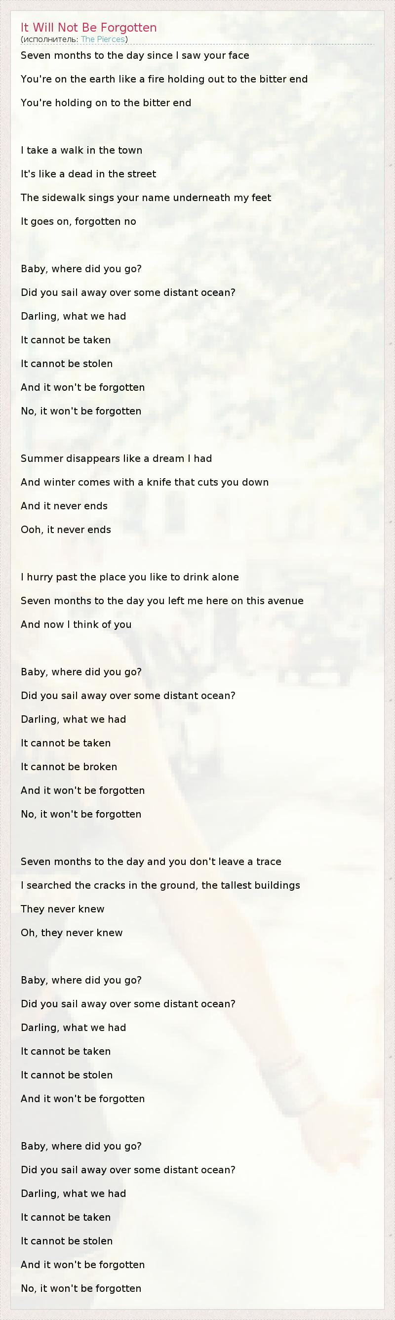 ГлавнаяИсполнителиThe PiercesIt Will Not Be Forgotten