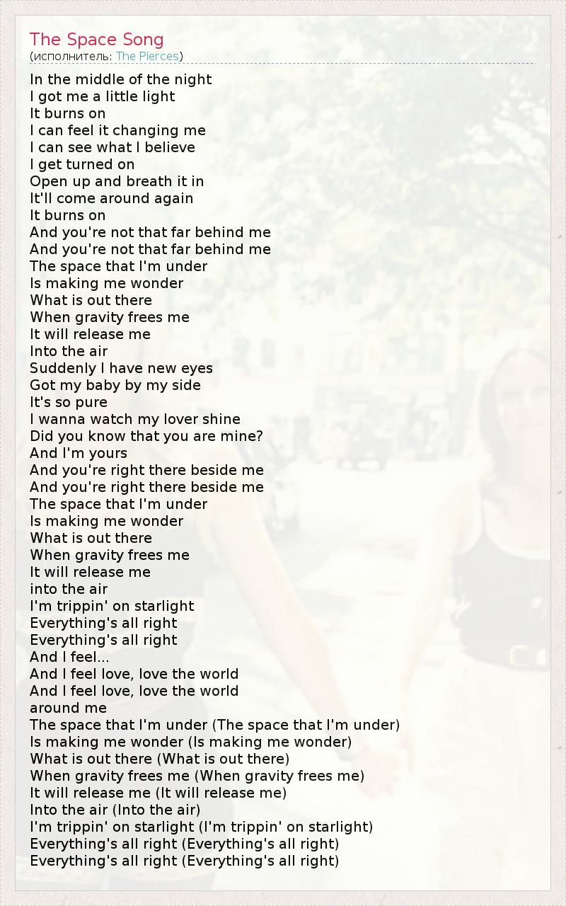 In the middle of the night I got me a little light It burns on I can feel it changing me I can see what I believe I get turned on Open up and breath it in It'll come around again It burns on And you're not that far behind me And you're not that far behind me The space that I'm under Is making me wonder What is out there When gravity frees me It will release me Into the air Suddenly I have new eyes Got my baby by my side It's so pure I wanna watch my lover shine Did you know that you are mine? And I'm yours And you're right there beside me And you're right there beside me The space that I'm under Is making me wonder What is out there When gravity frees me It will release me into the air I'm trippin' on starlight Everything's all right Everything's all right And I feel... And I feel love, love the world And I feel love, love the world around me The space that I'm under (The space that I'm under) Is making me wonder (Is making me wonder) What is out there (What is out there) When gravity frees me (When gravity frees me) It will release me (It will release me) Into the air (Into the air) I'm trippin' on starlight (I'm trippin' on starlight) Everything's all right (Everything's all right) Everything's all right (Everything's all right)