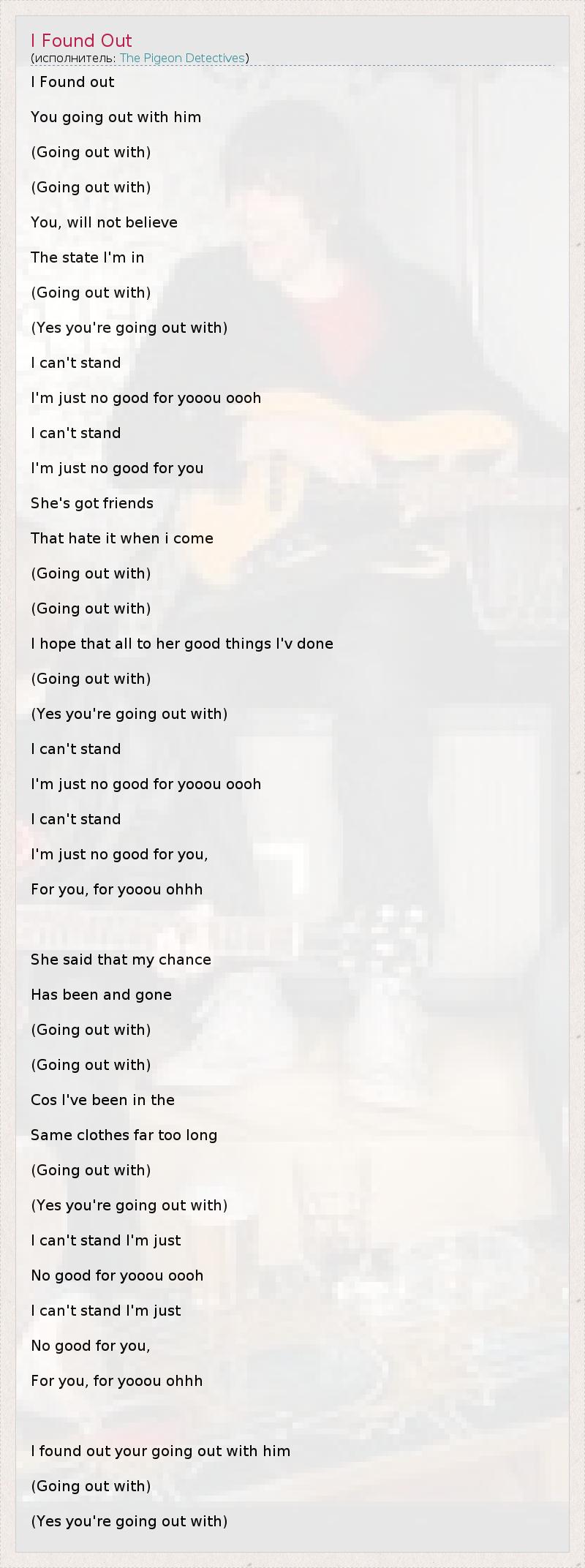I Found out You going out with him (Going out with) (Going out with) You, will not believe The state I'm in (Going out with) (Yes you're going out with) I can't stand I'm just no good for yooou oooh I can't stand I'm just no good for you She's got friends That hate it when i come (Going out with) (Going out with) I hope that all to her good things I'v done (Going out with) (Yes you're going out with) I can't stand I'm just no good for yooou oooh I can't stand I'm just no good for you, For you, for yooou ohhh She said that my chance Has been and gone (Going out with) (Going out with) Cos I've been in the Same clothes far too long (Going out with) (Yes you're going out with) I can't stand I'm just No good for yooou oooh I can't stand I'm just No good for you, For you, for yooou ohhh I found out your going out with him (Going out with) (Yes you're going out with)