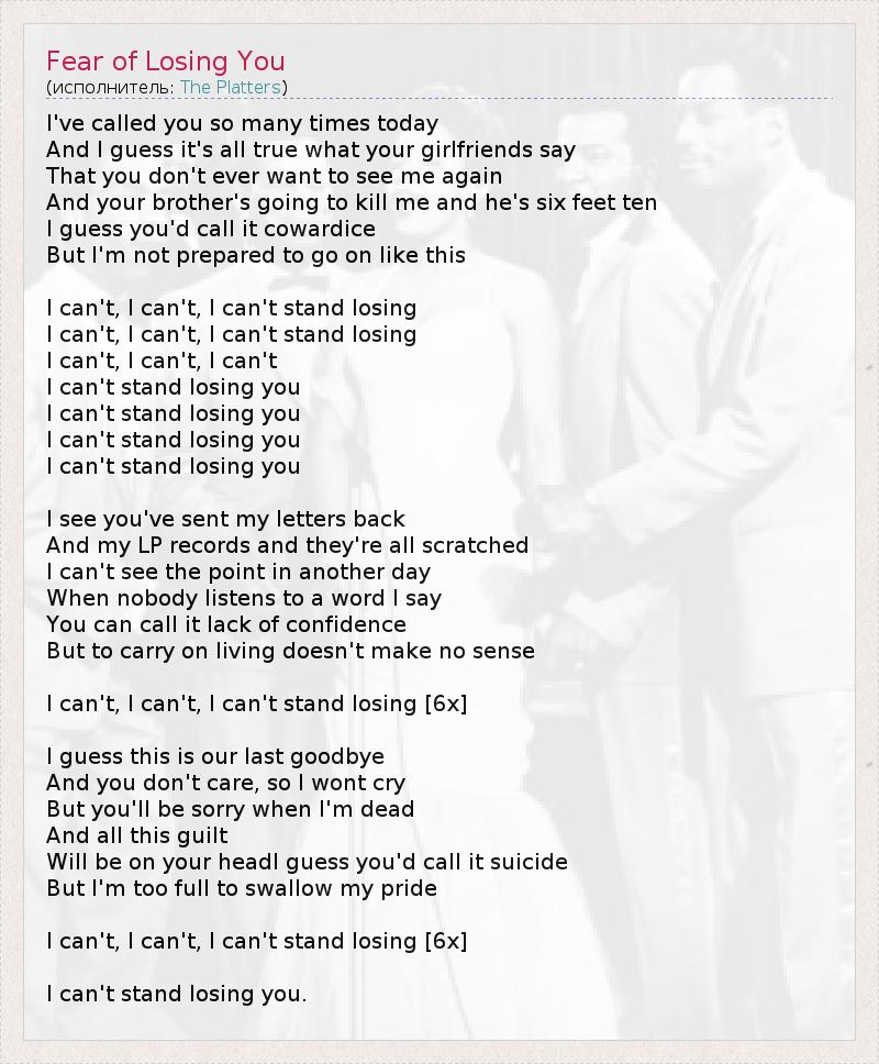 Сегодня я звонил тебе уже тысячу раз. И, наверное, все, что сказали твои подружки - правда: Ты больше никогда не захочешь меня видеть, И твой брат убьет меня, а ведь он два метра ростом. Наверное, ты скажешь, что я трус, Но я к такому повороту событий я совсем не готов. Я не хочу, не хочу, не хочу терять Я не хочу, не хочу, не хочу терять Я не хочу, не хочу, не хочу Я не хочу терять тебя Я не хочу терять тебя Я не хочу терять тебя Я не хочу терять тебя Вижу, ты отправила все мои письма назад, И все мои пластинки, да они еще и испорчены. Мне хочется уснуть и никогда не просыпаться, Ведь никто даже не слушает, что я говорю. Ты назовешь это неуверенностью в себе, Но жить дальше - бессмысленно. Я не хочу, не хочу, не хочу терять [6x] Кажется, это наше последнее "прощай". И раз тебе все равно, лить слезы я не буду. А вот ты поплачешь, когда я умру, И вся вина за мою гибель Будет лежать лишь на тебе. Наверное, ты назовешь это самоубийством, Но я сыт всем этим по горло и не собираюсь терпеть. Я не хочу, не хочу, не хочу терять [6x] Я не хочу терять тебя.
