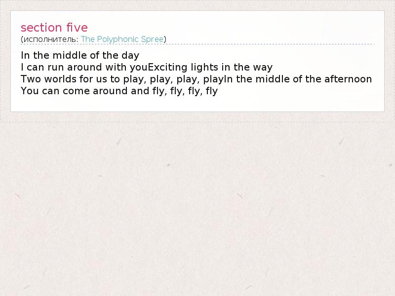 Это интересно:Dallas, Texas СШАОфициально образовались в летом 2005 года.Оригинальный стиль звучания этого немалочисленного коллектива сразу привлек внимание многих людей следящих за инди сценой.В шутку плоды творчества группы можно назвать детской музыкой для взрослых или взрослой музыкой для детей.Члены группы.. (их много :) )Вокал: TIM DELAUGHTER Бас: MARK PIRRO Барабаны: BRYAN WAKELAND Перкуссия:... продолжение