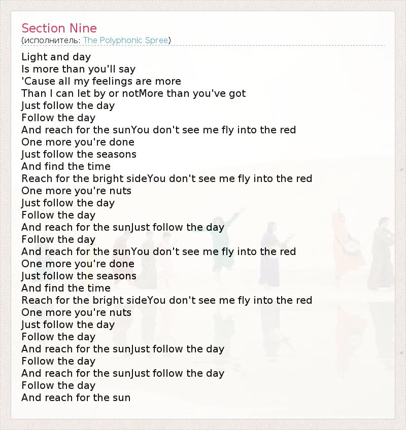 Light and day Is more than you'll say 'Cause all my feelings are more Than I can let by or notMore than you've got Just follow the day Follow the day And reach for the sunYou don't see me fly into the red One more you're done Just follow the seasons And find the time Reach for the bright sideYou don't see me fly into the red One more you're nuts Just follow the day Follow the day And reach for the sunJust follow the day Follow the day And reach for the sunYou don't see me fly into the red One more you're done Just follow the seasons And find the time Reach for the bright sideYou don't see me fly into the red One more you're nuts Just follow the day Follow the day And reach for the sunJust follow the day Follow the day And reach for the sunJust follow the day Follow the day And reach for the sun