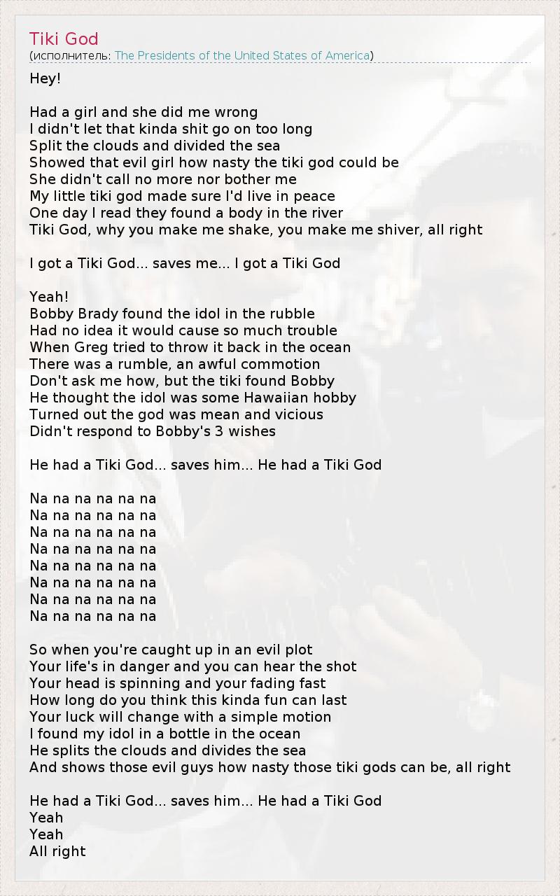 Hey! Had a girl and she did me wrong I didn't let that kinda shit go on too long Split the clouds and divided the sea Showed that evil girl how nasty the tiki god could be She didn't call no more nor bother me My little tiki god made sure I'd live in peace One day I read they found a body in the river Tiki God, why you make me shake, you make me shiver, all right I got a Tiki God... saves me... I got a Tiki God Yeah! Bobby Brady found the idol in the rubble Had no idea it would cause so much trouble When Greg tried to throw it back in the ocean There was a rumble, an awful commotion Don't ask me how, but the tiki found Bobby He thought the idol was some Hawaiian hobby Turned out the god was mean and vicious Didn't respond to Bobby's 3 wishes He had a Tiki God... saves him... He had a Tiki God Na na na na na na Na na na na na na Na na na na na na Na na na na na na Na na na na na na Na na na na na na Na na na na na na Na na na na na na So when you're caught up in an evil plot Your life's in danger and you can hear the shot Your head is spinning and your fading fast How long do you think this kinda fun can last Your luck will change with a simple motion I found my idol in a bottle in the ocean He splits the clouds and divides the sea And shows those evil guys how nasty those tiki gods can be, all right He had a Tiki God... saves him... He had a Tiki God Yeah Yeah All right