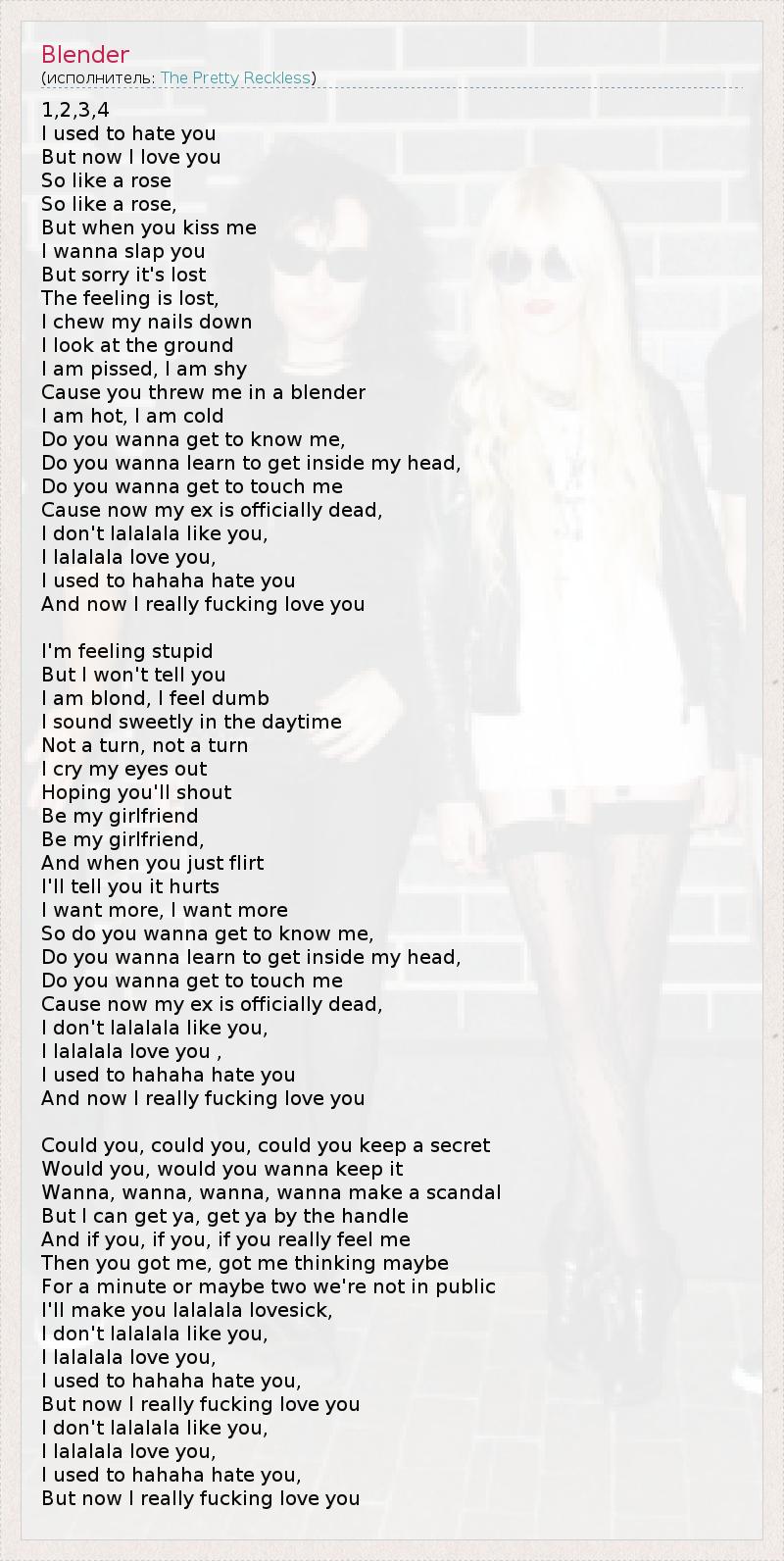 1,2,3,4 I used to hate you But now I love you So like a rose So like a rose, But when you kiss me I wanna slap you But sorry it's lost The feeling is lost, I chew my nails down I look at the ground I am pissed, I am shy Cause you threw me in a blender I am hot, I am cold Do you wanna get to know me, Do you wanna learn to get inside my head, Do you wanna get to touch me Cause now my ex is officially dead, I don't lalalala like you, I lalalala love you, I used to hahaha hate you And now I really fucking love you I'm feeling stupid But I won't tell you I am blond, I feel dumb I sound sweetly in the daytime Not a turn, not a turn I cry my eyes out Hoping you'll shout Be my girlfriend Be my girlfriend, And when you just flirt I'll tell you it hurts I want more, I want more So do you wanna get to know me, Do you wanna learn to get inside my head, Do you wanna get to touch me Cause now my ex is officially dead, I don't lalalala like you, I lalalala love you , I used to hahaha hate you And now I really fucking love you Could you, could you, could you keep a secret Would you, would you wanna keep it Wanna, wanna, wanna, wanna make a scandal But I can get ya, get ya by the handle And if you, if you, if you really feel me Then you got me, got me thinking maybe For a minute or maybe two we're not in public I'll make you lalalala lovesick, I don't lalalala like you, I lalalala love you, I used to hahaha hate you, But now I really fucking love you I don't lalalala like you, I lalalala love you, I used to hahaha hate you, But now I really fucking love you