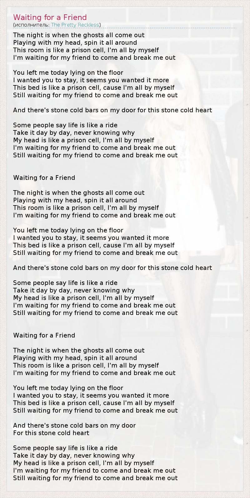 The night is when the ghosts all come out Playing with my head, spin it all around This room is like a prison cell, I'm all by myself I'm waiting for my friend to come and break me out You left me today lying on the floor I wanted you to stay, it seems you wanted it more This bed is like a prison cell, cause I'm all by myself Still waiting for my friend to come and break me out And there's stone cold bars on my door for this stone cold heart Some people say life is like a ride Take it day by day, never knowing why My head is like a prison cell, I'm all by myself I'm waiting for my friend to come and break me out Still waiting for my friend to come and break me out Waiting for a Friend The night is when the ghosts all come out Playing with my head, spin it all around This room is like a prison cell, I'm all by myself I'm waiting for my friend to come and break me out You left me today lying on the floor I wanted you to stay, it seems you wanted it more This bed is like a prison cell, cause I'm all by myself Still waiting for my friend to come and break me out And there's stone cold bars on my door for this stone cold heart Some people say life is like a ride Take it day by day, never knowing why My head is like a prison cell, I'm all by myself I'm waiting for my friend to come and break me out Still waiting for my friend to come and break me out Waiting for a Friend The night is when the ghosts all come out Playing with my head, spin it all around This room is like a prison cell, I'm all by myself I'm waiting for my friend to come and break me out You left me today lying on the floor I wanted you to stay, it seems you wanted it more This bed is like a prison cell, cause I'm all by myself Still waiting for my friend to come and break me out And there's stone cold bars on my door For this stone cold heart Some people say life is like a ride Take it day by day, never knowing why My head is like a prison cell, I'm all by myself I'm waiting for my friend to come and break me out Still waiting for my friend to come and break me out