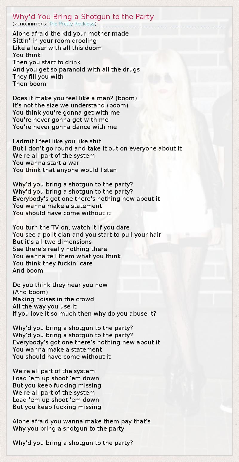 А как ты думаешь, о чем песня "Why'd You Bring a Shotgun to the Party" ?