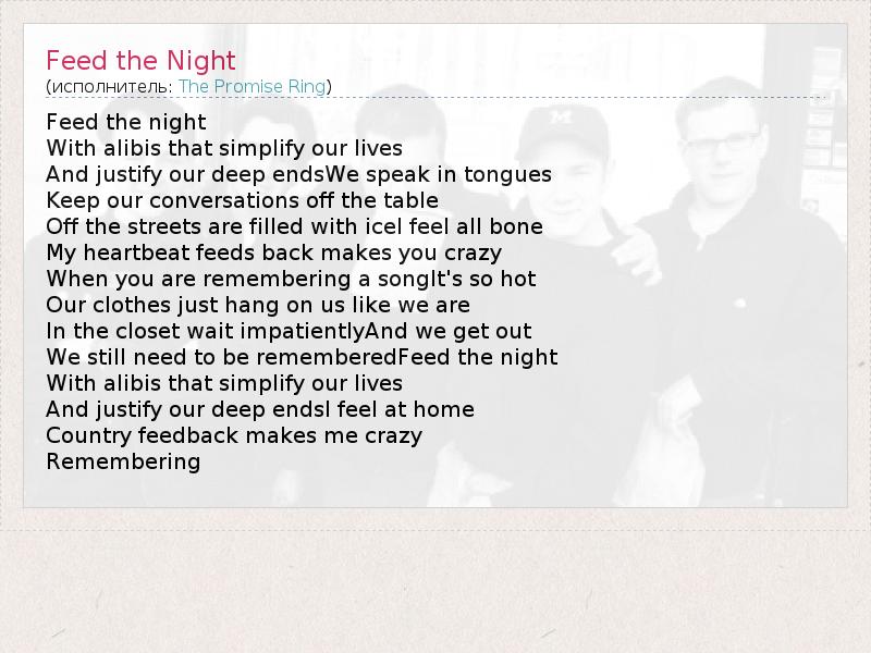 А как ты думаешь, о чем песня "Feed the Night" ?