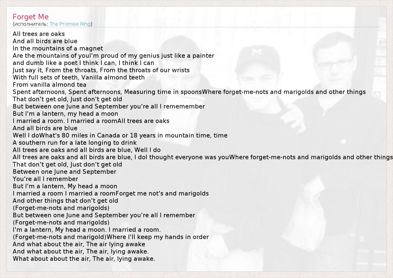 Это интересно:Группа The Promise Ring сформировалась в начале 1995 года в городе Милуоки, штат Висконсин и состояла из участников различных имо-групп. Гитарист и вокалист Дейви вон Болем начал упражняться в игре с гитаристом Джейсоном Гневиковым (раньше играл в None Left Standing), барабанщиком Деном Дидиэром(раньше был в группе Ceilishrine) и басистом Скоттом Бештой, когда сам... продолжение