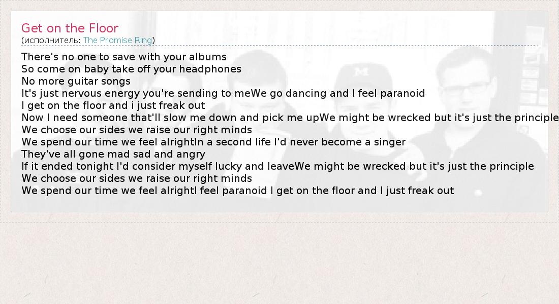 Это интересно:Группа The Promise Ring сформировалась в начале 1995 года в городе Милуоки, штат Висконсин и состояла из участников различных имо-групп. Гитарист и вокалист Дейви вон Болем начал упражняться в игре с гитаристом Джейсоном Гневиковым (раньше играл в None Left Standing), барабанщиком Деном Дидиэром(раньше был в группе Ceilishrine) и басистом Скоттом Бештой, когда сам... продолжение