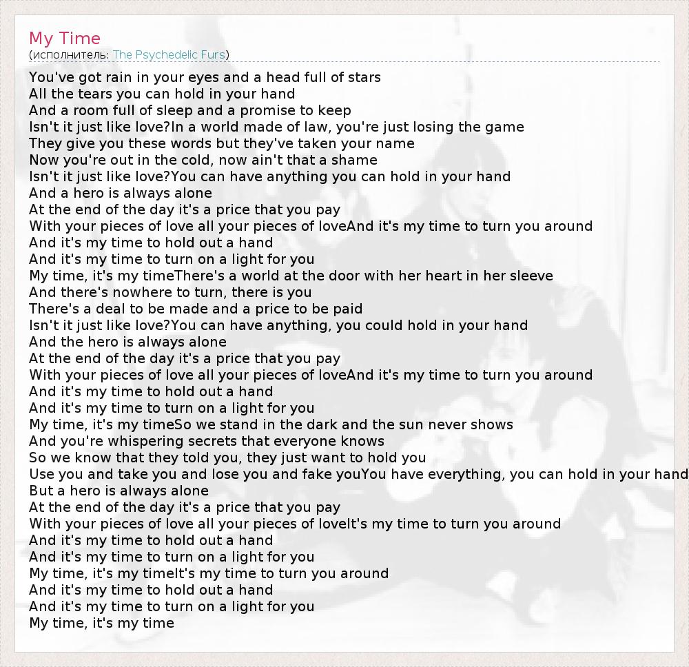 You've got rain in your eyes and a head full of stars All the tears you can hold in your hand And a room full of sleep and a promise to keep Isn't it just like love?In a world made of law, you're just losing the game They give you these words but they've taken your name Now you're out in the cold, now ain't that a shame Isn't it just like love?You can have anything you can hold in your hand And a hero is always alone At the end of the day it's a price that you pay With your pieces of love all your pieces of loveAnd it's my time to turn you around And it's my time to hold out a hand And it's my time to turn on a light for you My time, it's my timeThere's a world at the door with her heart in her sleeve And there's nowhere to turn, there is you There's a deal to be made and a price to be paid Isn't it just like love?You can have anything, you could hold in your hand And the hero is always alone At the end of the day it's a price that you pay With your pieces of love all your pieces of loveAnd it's my time to turn you around And it's my time to hold out a hand And it's my time to turn on a light for you My time, it's my timeSo we stand in the dark and the sun never shows And you're whispering secrets that everyone knows So we know that they told you, they just want to hold you Use you and take you and lose you and fake youYou have everything, you can hold in your hand But a hero is always alone At the end of the day it's a price that you pay With your pieces of love all your pieces of loveIt's my time to turn you around And it's my time to hold out a hand And it's my time to turn on a light for you My time, it's my timeIt's my time to turn you around And it's my time to hold out a hand And it's my time to turn on a light for you My time, it's my time