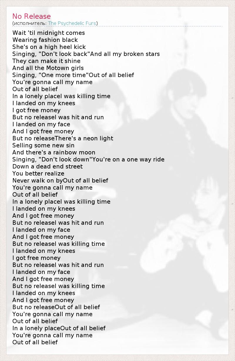 Это интересно:The Psychedelic Furs - выходцы лондонской панк-сцены конца 70-х. Основана группа в 1977 году, в ее состав тогда входили Richard Butler (вокал), Tim Butler (бас-гитара), Duncan Kilburn (саксофон), Paul Wilson (ударные) и Roger Morris (гитара). Первоначально фигурировало 3 варианта названия группы: "Radio", "The Europeans" и "The Psychedelic Furs", остановились на последнем и стали репетировать. В 1979 году в группе произошли небольшие изменения,... продолжение