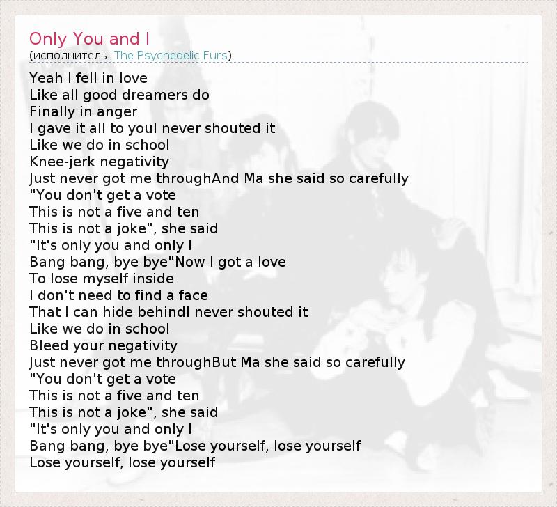 Yeah I fell in love Like all good dreamers do Finally in anger I gave it all to youI never shouted it Like we do in school Knee-jerk negativity Just never got me throughAnd Ma she said so carefully "You don't get a vote This is not a five and ten This is not a joke", she said "It's only you and only I Bang bang, bye bye"Now I got a love To lose myself inside I don't need to find a face That I can hide behindI never shouted it Like we do in school Bleed your negativity Just never got me throughBut Ma she said so carefully "You don't get a vote This is not a five and ten This is not a joke", she said "It's only you and only I Bang bang, bye bye"Lose yourself, lose yourself Lose yourself, lose yourself