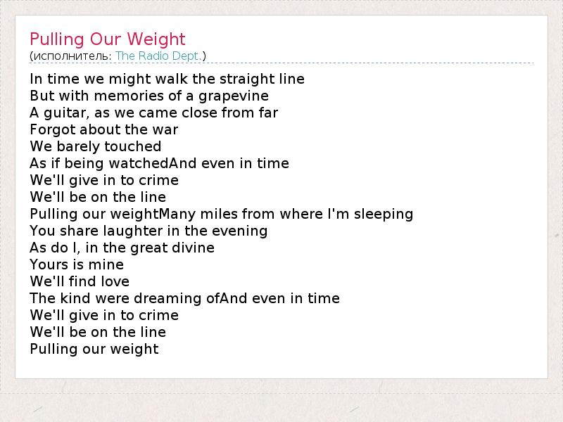 А как ты думаешь, о чем песня "Pulling Our Weight" ?