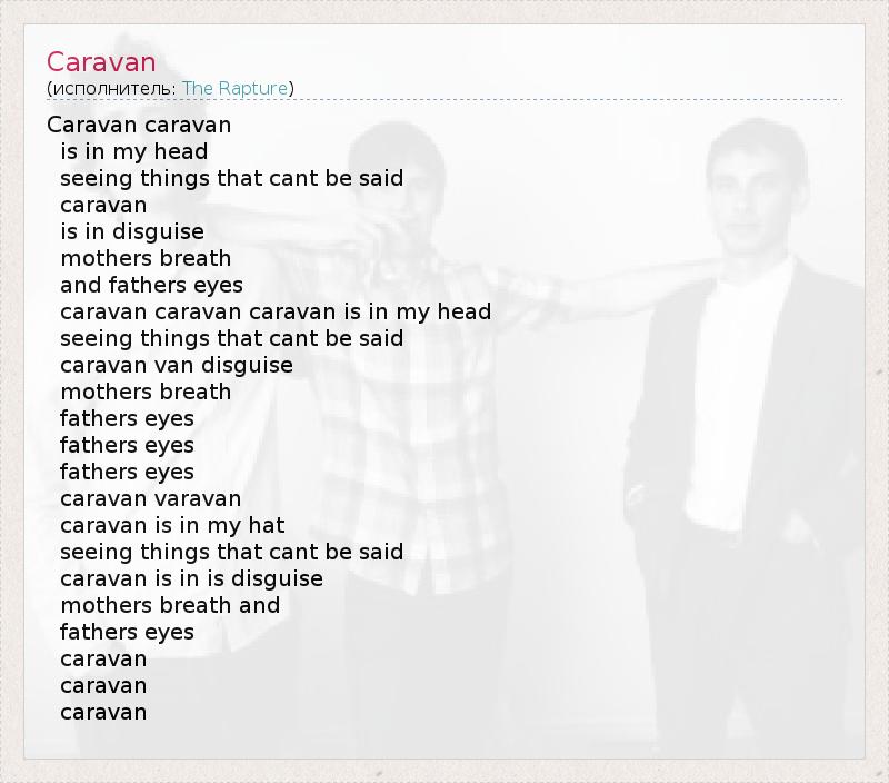 Caravan caravan is in my head seeing things that cant be said caravan is in disguise mothers breath and fathers eyes caravan caravan caravan is in my head seeing things that cant be said caravan van disguise mothers breath fathers eyes fathers eyes fathers eyes caravan varavan caravan is in my hat seeing things that cant be said caravan is in is disguise mothers breath and fathers eyes caravan caravan caravan