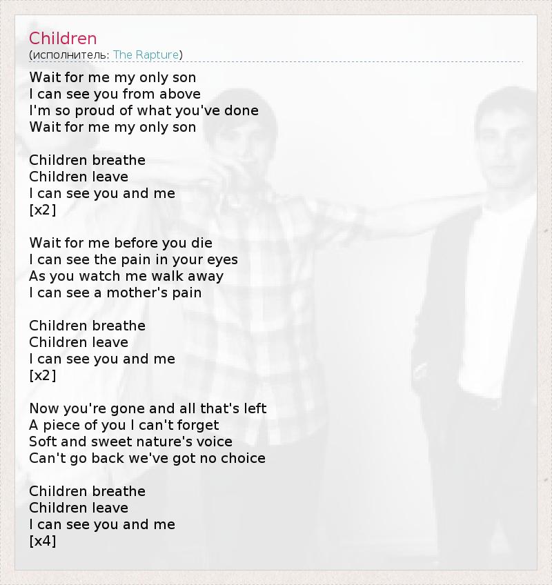 Wait for me my only son I can see you from above I'm so proud of what you've done Wait for me my only son Children breathe Children leave I can see you and me [x2] Wait for me before you die I can see the pain in your eyes As you watch me walk away I can see a mother's pain Children breathe Children leave I can see you and me [x2] Now you're gone and all that's left A piece of you I can't forget Soft and sweet nature's voice Can't go back we've got no choice Children breathe Children leave I can see you and me [x4]