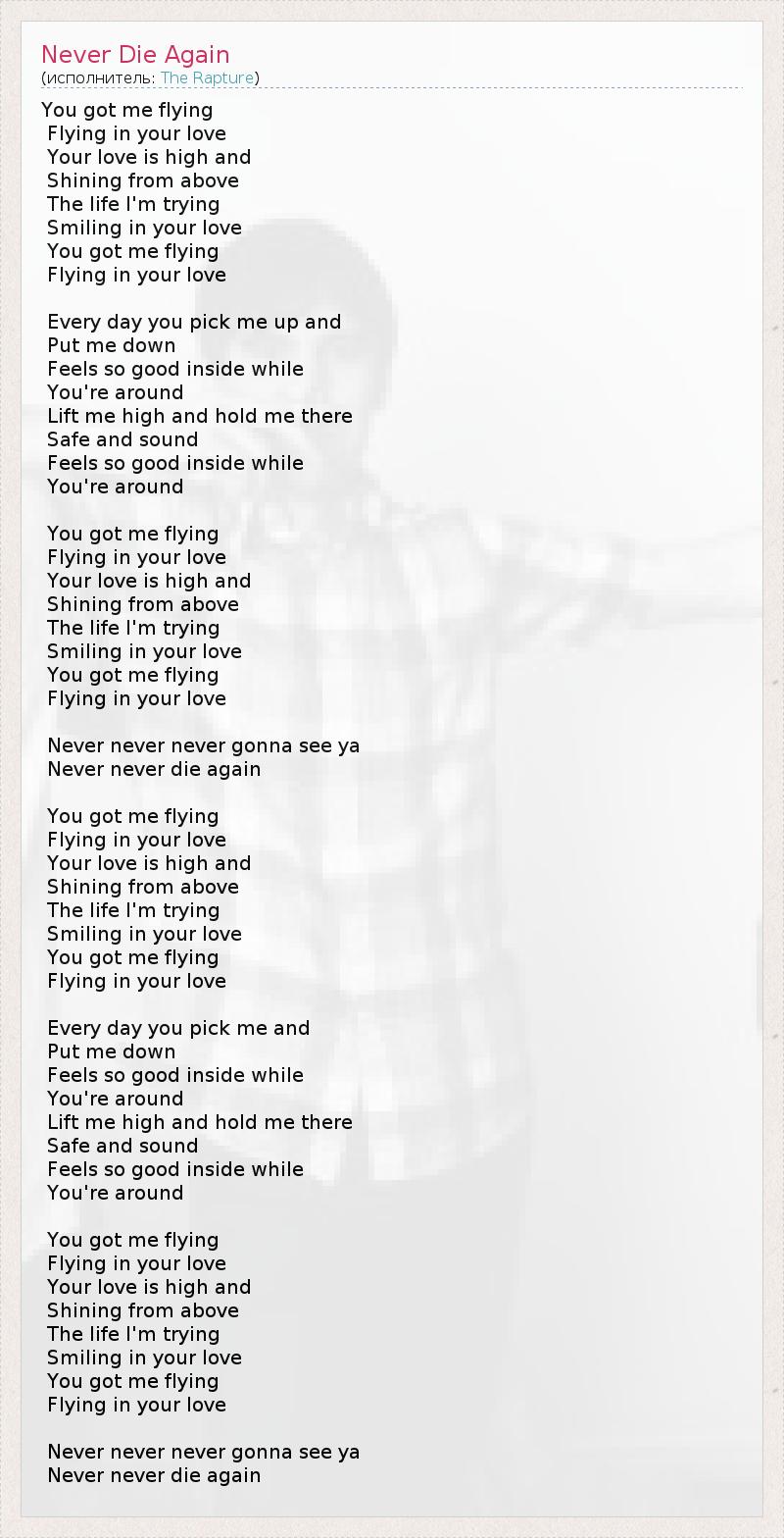 Ты меня летать Полеты в вашей любви Ваша любовь является высоким и Сияющий сверху Жизнь, которую я пытаюсь Улыбаясь в вашей любви Ты меня летать Полеты в вашей любви Каждый день вы забрать меня и Отпусти меня Чувствует себя так хорошо внутри время Ты вокруг Поднимите меня высокая и держать меня есть Цел и невредим Чувствует себя так хорошо внутри время Ты вокруг Ты меня летать Полеты в вашей любви Ваша любовь является высоким и Сияющий сверху Жизнь, которую я пытаюсь Улыбаясь в вашей любви Ты меня летать Полеты в вашей любви Никогда никогда не увижу я Никогда не не умирает Ты меня летать Полеты в вашей любви Ваша любовь является высоким и Сияющий сверху Жизнь, которую я пытаюсь Улыбаясь в вашей любви Ты меня летать Полеты в вашей любви Каждый день вы забрать меня и Отпусти меня Чувствует себя так хорошо внутри время Ты вокруг Поднимите меня высокая и держать меня есть Цел и невредим Чувствует себя так хорошо внутри время Ты вокруг Ты меня летать Полеты в вашей любви Ваша любовь является высоким и Сияющий сверху Жизнь, которую я пытаюсь Улыбаясь в вашей любви Ты меня летать Полеты в вашей любви Никогда никогда не увижу я Никогда не не умирает