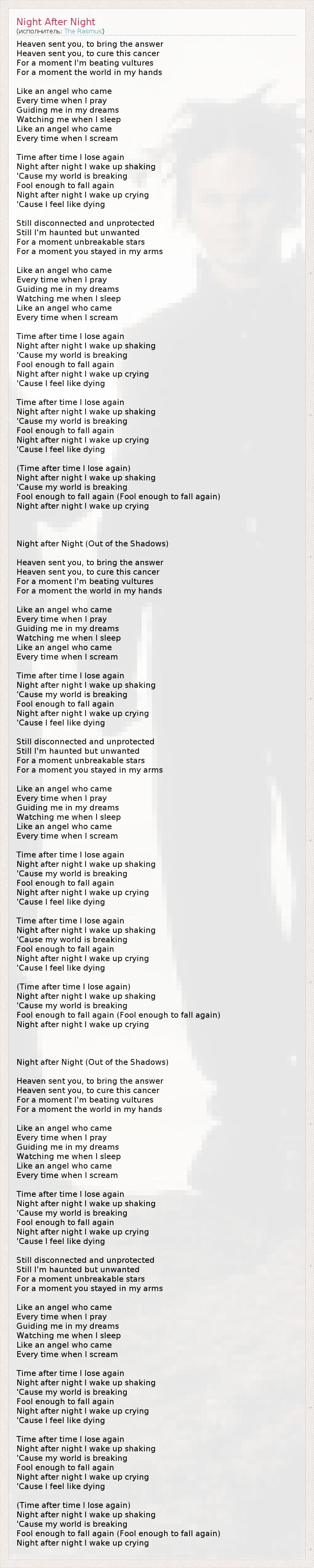Heaven sent you, to bring the answer Heaven sent you, to cure this cancer For a moment I'm beating vultures For a moment the world in my hands Like an angel who came Every time when I pray Guiding me in my dreams Watching me when I sleep Like an angel who came Every time when I scream Time after time I lose again Night after night I wake up shaking 'Cause my world is breaking Fool enough to fall again Night after night I wake up crying 'Cause I feel like dying Still disconnected and unprotected Still I'm haunted but unwanted For a moment unbreakable stars For a moment you stayed in my arms Like an angel who came Every time when I pray Guiding me in my dreams Watching me when I sleep Like an angel who came Every time when I scream Time after time I lose again Night after night I wake up shaking 'Cause my world is breaking Fool enough to fall again Night after night I wake up crying 'Cause I feel like dying Time after time I lose again Night after night I wake up shaking 'Cause my world is breaking Fool enough to fall again Night after night I wake up crying 'Cause I feel like dying (Time after time I lose again) Night after night I wake up shaking 'Cause my world is breaking Fool enough to fall again (Fool enough to fall again) Night after night I wake up crying Night after Night (Out of the Shadows) Heaven sent you, to bring the answer Heaven sent you, to cure this cancer For a moment I'm beating vultures For a moment the world in my hands Like an angel who came Every time when I pray Guiding me in my dreams Watching me when I sleep Like an angel who came Every time when I scream Time after time I lose again Night after night I wake up shaking 'Cause my world is breaking Fool enough to fall again Night after night I wake up crying 'Cause I feel like dying Still disconnected and unprotected Still I'm haunted but unwanted For a moment unbreakable stars For a moment you stayed in my arms Like an angel who came Every time when I pray Guiding me in my dreams Watching me when I sleep Like an angel who came Every time when I scream Time after time I lose again Night after night I wake up shaking 'Cause my world is breaking Fool enough to fall again Night after night I wake up crying 'Cause I feel like dying Time after time I lose again Night after night I wake up shaking 'Cause my world is breaking Fool enough to fall again Night after night I wake up crying 'Cause I feel like dying (Time after time I lose again) Night after night I wake up shaking 'Cause my world is breaking Fool enough to fall again (Fool enough to fall again) Night after night I wake up crying Night after Night (Out of the Shadows) Heaven sent you, to bring the answer Heaven sent you, to cure this cancer For a moment I'm beating vultures For a moment the world in my hands Like an angel who came Every time when I pray Guiding me in my dreams Watching me when I sleep Like an angel who came Every time when I scream Time after time I lose again Night after night I wake up shaking 'Cause my world is breaking Fool enough to fall again Night after night I wake up crying 'Cause I feel like dying Still disconnected and unprotected Still I'm haunted but unwanted For a moment unbreakable stars For a moment you stayed in my arms Like an angel who came Every time when I pray Guiding me in my dreams Watching me when I sleep Like an angel who came Every time when I scream Time after time I lose again Night after night I wake up shaking 'Cause my world is breaking Fool enough to fall again Night after night I wake up crying 'Cause I feel like dying Time after time I lose again Night after night I wake up shaking 'Cause my world is breaking Fool enough to fall again Night after night I wake up crying 'Cause I feel like dying (Time after time I lose again) Night after night I wake up shaking 'Cause my world is breaking Fool enough to fall again (Fool enough to fall again) Night after night I wake up crying