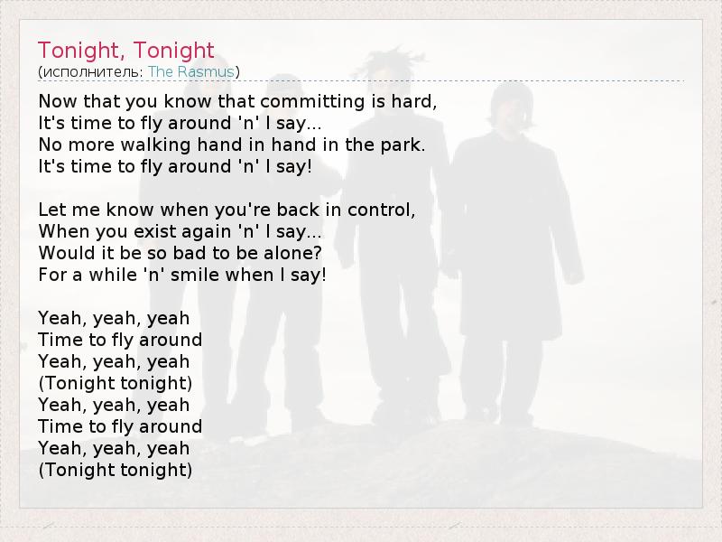 Now that you know that committing is hard, It's time to fly around 'n' I say... No more walking hand in hand in the park. It's time to fly around 'n' I say! Let me know when you're back in control, When you exist again 'n' I say... Would it be so bad to be alone? For a while 'n' smile when I say! Yeah, yeah, yeah Time to fly around Yeah, yeah, yeah (Tonight tonight) Yeah, yeah, yeah Time to fly around Yeah, yeah, yeah (Tonight tonight)