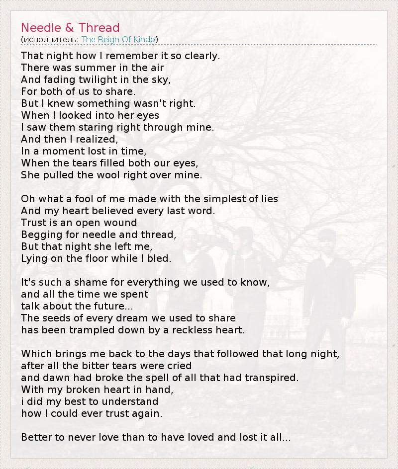 А как ты думаешь, о чем песня "Needle & Thread" ?