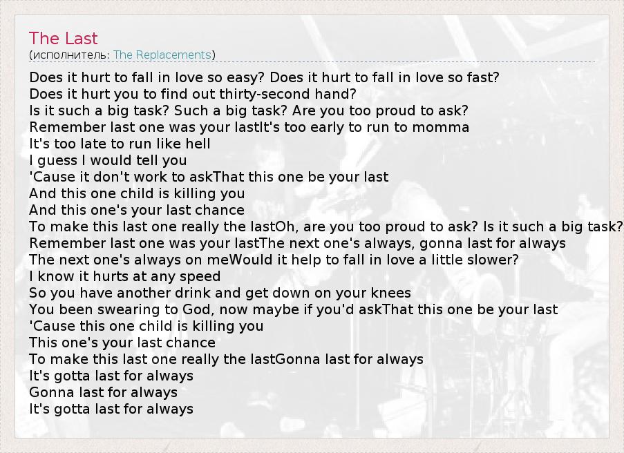 Does it hurt to fall in love so easy? Does it hurt to fall in love so fast? Does it hurt you to find out thirty-second hand? Is it such a big task? Such a big task? Are you too proud to ask? Remember last one was your lastIt's too early to run to momma It's too late to run like hell I guess I would tell you 'Cause it don't work to askThat this one be your last And this one child is killing you And this one's your last chance To make this last one really the lastOh, are you too proud to ask? Is it such a big task? Remember last one was your lastThe next one's always, gonna last for always The next one's always on meWould it help to fall in love a little slower? I know it hurts at any speed So you have another drink and get down on your knees You been swearing to God, now maybe if you'd askThat this one be your last 'Cause this one child is killing you This one's your last chance To make this last one really the lastGonna last for always It's gotta last for always Gonna last for always It's gotta last for always
