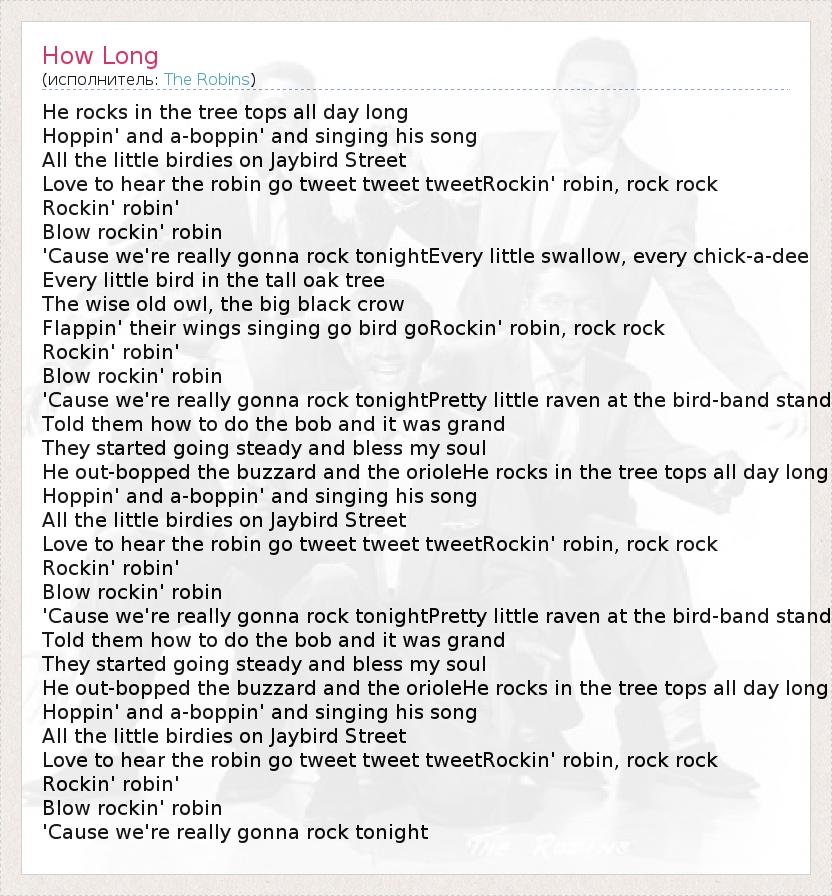 Love to hear the robin go tweet tweet tweetRockin' robin, rock rock
