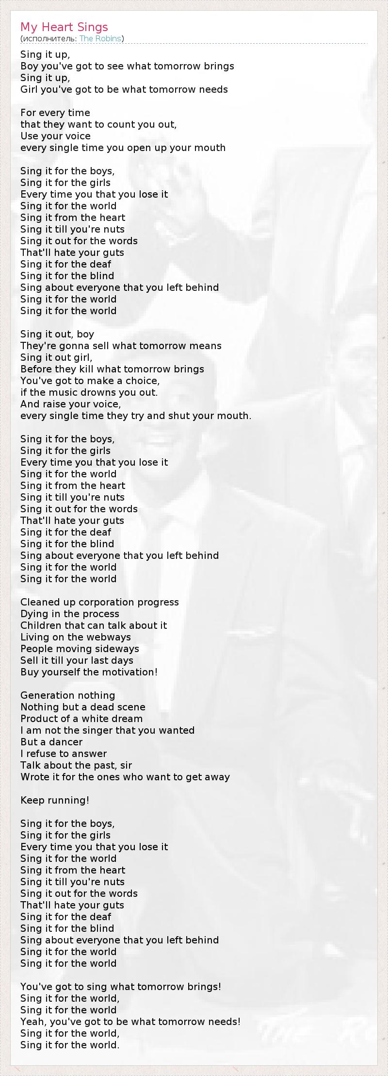 Пой громче, мальчишка, Ты должен увидеть, что принесет нам завтрашний день. Пой громче, девчонка, Ты должна стать той, что нужна завтрашнему дню. Ибо каждый раз, Когда тебя хотят исключить из игры, Используй свой голос Каждый раз, когда открываешь рот! Пой ради мальчишек, Пой ради девчонок, После каждой утраты Пой ради всего мира! Пой от всей души, Пой, пока не свихнешься, Пой ради тех, Кто будет тебя на дух не переносить. Пой для глухих, Пой для слепых, Пой про всех, кого ты оставил в прошлом. Пой ради этого мира, Пой ради всего мира! Пой громче, мальчишка, Они собираются продать все, что является будущим. Запой, девчонка, Пока они не убили все, что принесет будущее. Ты должен сделать выбор, Если музыка заглушает тебя, И повышать свой голос Каждый раз, когда они пытаются заткнуть тебе рот. Пой ради мальчишек, Пой ради девчонок, После каждой утраты Пой ради всего мира! Пой от всей души, Пой, пока не свихнешься, Пой ради тех, Кто будет тебя на дух не переносить. Пой для глухих, Пой для слепых, Пой про всех, кого ты оставил в прошлом. Пой ради этого мира, Пой ради всего мира! Сорван большой куш, но развитие корпорации По ходу прекращается... Дети, которые могут говорить об этом, Живут на просторах всемирной паутины. Люди продвигаются по карьерной лестнице, Продаваясь до последнего дня. Купи себе мотивацию! Поколение "ничто" - Ничего, кроме мертвого зрелища, Результат чистой мечты. Я не тот певец, которого вы хотели, Я танцор И отказываюсь отвечать, Говорить о прошлом, сэр. Я написал это для тех, кто хочет удрать... Бегите, не останавливайтесь! Пой ради мальчишек, Пой ради девчонок, После каждой утраты Пой ради всего мира! Пой от всей души, Пой, пока не свихнешься, Пой ради тех, Кто будет тебя на дух не переносить. Пой для глухих, Пой для слепых, Пой про всех, кого ты оставил в прошлом. Пой ради этого мира, Пой ради всего мира! Ты должен увидеть, что принесет нам завтрашний день. Пой ради этого мира, Пой ради мира. Да, ты должен стать тем, кто нужен завтрашнему дню! Пой ради этого мира, Пой ради мира...