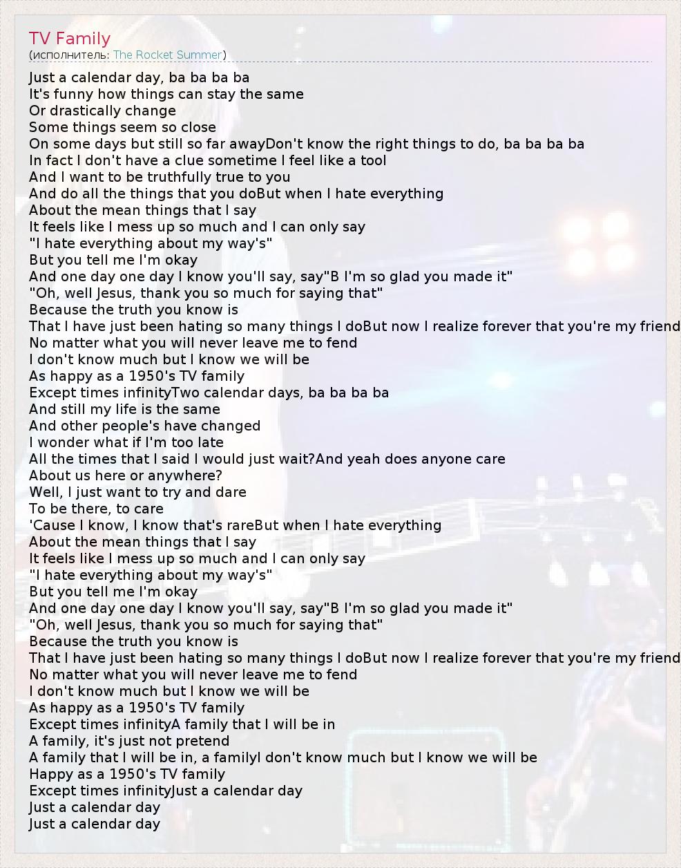Just a calendar day, ba ba ba ba It's funny how things can stay the same Or drastically change Some things seem so close On some days but still so far awayDon't know the right things to do, ba ba ba ba In fact I don't have a clue sometime I feel like a tool And I want to be truthfully true to you And do all the things that you doBut when I hate everything About the mean things that I say It feels like I mess up so much and I can only say "I hate everything about my way's" But you tell me I'm okay And one day one day I know you'll say, say"B I'm so glad you made it" "Oh, well Jesus, thank you so much for saying that" Because the truth you know is That I have just been hating so many things I doBut now I realize forever that you're my friend No matter what you will never leave me to fend I don't know much but I know we will be As happy as a 1950's TV family Except times infinityTwo calendar days, ba ba ba ba And still my life is the same And other people's have changed I wonder what if I'm too late All the times that I said I would just wait?And yeah does anyone care About us here or anywhere? Well, I just want to try and dare To be there, to care 'Cause I know, I know that's rareBut when I hate everything About the mean things that I say It feels like I mess up so much and I can only say "I hate everything about my way's" But you tell me I'm okay And one day one day I know you'll say, say"B I'm so glad you made it" "Oh, well Jesus, thank you so much for saying that" Because the truth you know is That I have just been hating so many things I doBut now I realize forever that you're my friend No matter what you will never leave me to fend I don't know much but I know we will be As happy as a 1950's TV family Except times infinityA family that I will be in A family, it's just not pretend A family that I will be in, a familyI don't know much but I know we will be Happy as a 1950's TV family Except times infinityJust a calendar day Just a calendar day Just a calendar day