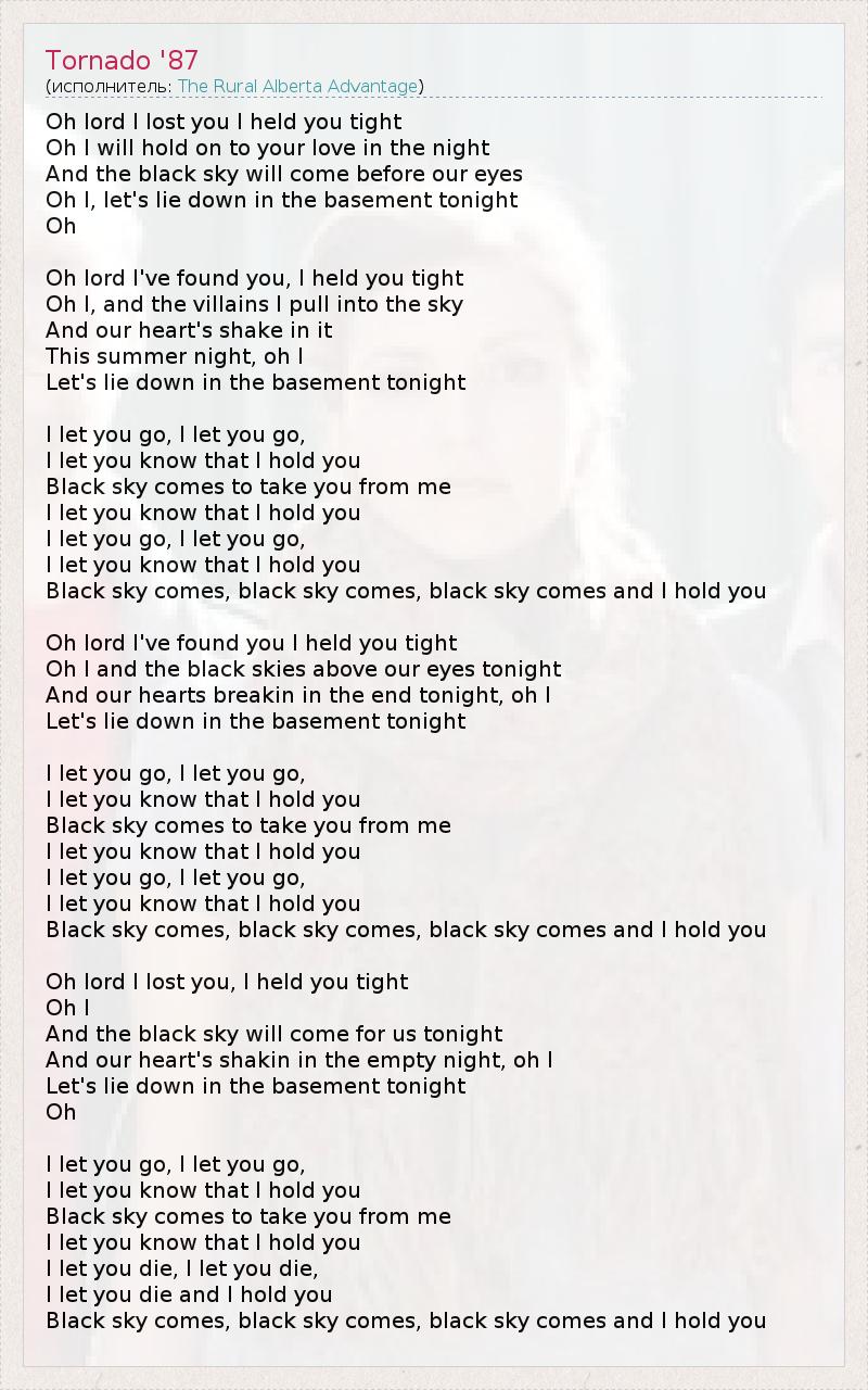 Oh lord I lost you I held you tight Oh I will hold on to your love in the night And the black sky will come before our eyes Oh I, let's lie down in the basement tonight Oh Oh lord I've found you, I held you tight Oh I, and the villains I pull into the sky And our heart's shake in it This summer night, oh I Let's lie down in the basement tonight I let you go, I let you go, I let you know that I hold you Black sky comes to take you from me I let you know that I hold you I let you go, I let you go, I let you know that I hold you Black sky comes, black sky comes, black sky comes and I hold you Oh lord I've found you I held you tight Oh I and the black skies above our eyes tonight And our hearts breakin in the end tonight, oh I Let's lie down in the basement tonight I let you go, I let you go, I let you know that I hold you Black sky comes to take you from me I let you know that I hold you I let you go, I let you go, I let you know that I hold you Black sky comes, black sky comes, black sky comes and I hold you Oh lord I lost you, I held you tight Oh I And the black sky will come for us tonight And our heart's shakin in the empty night, oh I Let's lie down in the basement tonight Oh I let you go, I let you go, I let you know that I hold you Black sky comes to take you from me I let you know that I hold you I let you die, I let you die, I let you die and I hold you Black sky comes, black sky comes, black sky comes and I hold you