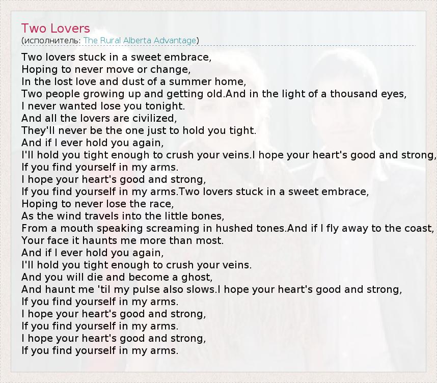 Two lovers stuck in a sweet embrace, Hoping to never move or change, In the lost love and dust of a summer home, Two people growing up and getting old.And in the light of a thousand eyes, I never wanted lose you tonight. And all the lovers are civilized, They'll never be the one just to hold you tight. And if I ever hold you again, I'll hold you tight enough to crush your veins.I hope your heart's good and strong, If you find yourself in my arms. I hope your heart's good and strong, If you find yourself in my arms.Two lovers stuck in a sweet embrace, Hoping to never lose the race, As the wind travels into the little bones, From a mouth speaking screaming in hushed tones.And if I fly away to the coast, Your face it haunts me more than most. And if I ever hold you again, I'll hold you tight enough to crush your veins. And you will die and become a ghost, And haunt me 'til my pulse also slows.I hope your heart's good and strong, If you find yourself in my arms. I hope your heart's good and strong, If you find yourself in my arms. I hope your heart's good and strong, If you find yourself in my arms.