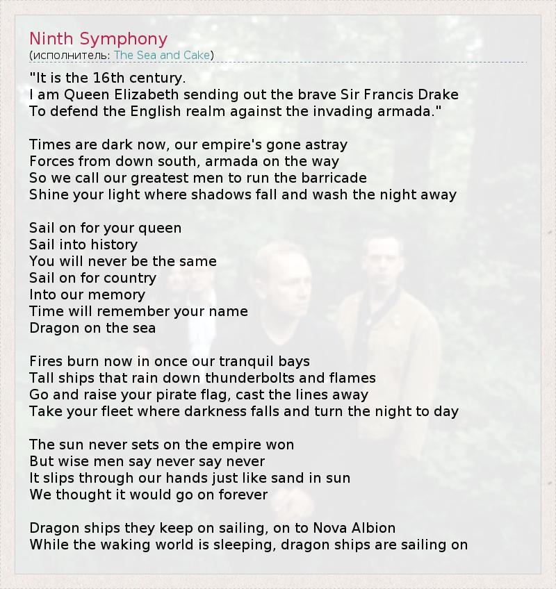 "It is the 16th century. I am Queen Elizabeth sending out the brave Sir Francis Drake To defend the English realm against the invading armada." Times are dark now, our empire's gone astray Forces from down south, armada on the way So we call our greatest men to run the barricade Shine your light where shadows fall and wash the night away Sail on for your queen Sail into history You will never be the same Sail on for country Into our memory Time will remember your name Dragon on the sea Fires burn now in once our tranquil bays Tall ships that rain down thunderbolts and flames Go and raise your pirate flag, cast the lines away Take your fleet where darkness falls and turn the night to day The sun never sets on the empire won But wise men say never say never It slips through our hands just like sand in sun We thought it would go on forever Dragon ships they keep on sailing, on to Nova Albion While the waking world is sleeping, dragon ships are sailing on