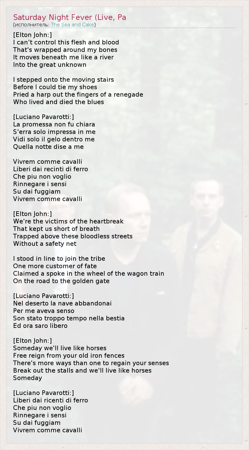 [Elton John:] I can't control this flesh and blood That's wrapped around my bones It moves beneath me like a river Into the great unknown I stepped onto the moving stairs Before I could tie my shoes Pried a harp out the fingers of a renegade Who lived and died the blues [Luciano Pavarotti:] La promessa non fu chiara S'erra solo impressa in me Vidi solo il gelo dentro me Quella notte dise a me Vivrem comme cavalli Liberi dai recinti di ferro Che piu non voglio Rinnegare i sensi Su dai fuggiam Vivrem comme cavalli [Elton John:] We're the victims of the heartbreak That kept us short of breath Trapped above these bloodless streets Without a safety net I stood in line to join the tribe One more customer of fate Claimed a spoke in the wheel of the wagon train On the road to the golden gate [Luciano Pavarotti:] Nel deserto la nave abbandonai Per me aveva senso Son stato troppo tempo nella bestia Ed ora saro libero [Elton John:] Someday we'll live like horses Free reign from your old iron fences There's more ways than one to regain your senses Break out the stalls and we'll live like horses Someday [Luciano Pavarotti:] Liberi dai ricenti di ferro Che piu non voglio Rinnegare i sensi Su dai fuggiam Vivrem comme cavalli