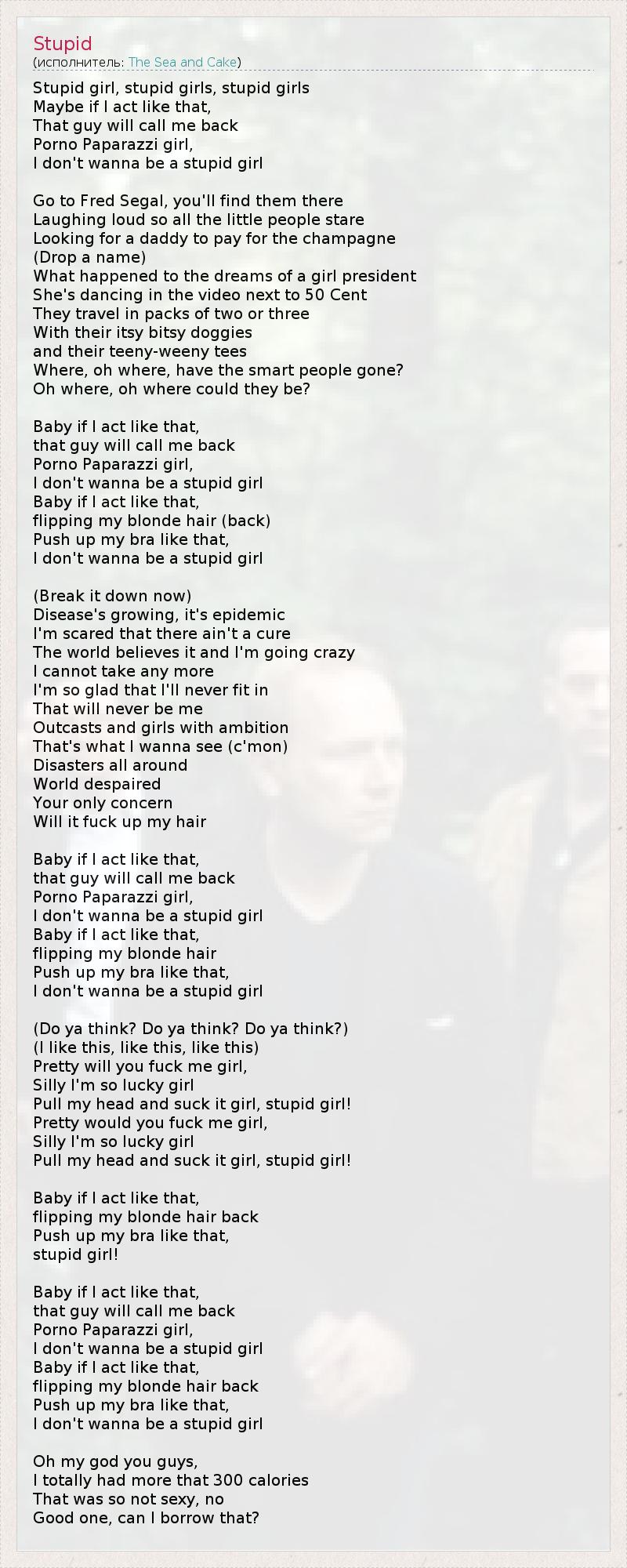 Stupid girl, stupid girls, stupid girls Maybe if I act like that, That guy will call me back Porno Paparazzi girl, I don't wanna be a stupid girl Go to Fred Segal, you'll find them there Laughing loud so all the little people stare Looking for a daddy to pay for the champagne (Drop a name) What happened to the dreams of a girl president She's dancing in the video next to 50 Cent They travel in packs of two or three With their itsy bitsy doggies and their teeny-weeny tees Where, oh where, have the smart people gone? Oh where, oh where could they be? Baby if I act like that, that guy will call me back Porno Paparazzi girl, I don't wanna be a stupid girl Baby if I act like that, flipping my blonde hair (back) Push up my bra like that, I don't wanna be a stupid girl (Break it down now) Disease's growing, it's epidemic I'm scared that there ain't a cure The world believes it and I'm going crazy I cannot take any more I'm so glad that I'll never fit in That will never be me Outcasts and girls with ambition That's what I wanna see (c'mon) Disasters all around World despaired Your only concern Will it fuck up my hair Baby if I act like that, that guy will call me back Porno Paparazzi girl, I don't wanna be a stupid girl Baby if I act like that, flipping my blonde hair Push up my bra like that, I don't wanna be a stupid girl (Do ya think? Do ya think? Do ya think?) (I like this, like this, like this) Pretty will you fuck me girl, Silly I'm so lucky girl Pull my head and suck it girl, stupid girl! Pretty would you fuck me girl, Silly I'm so lucky girl Pull my head and suck it girl, stupid girl! Baby if I act like that, flipping my blonde hair back Push up my bra like that, stupid girl! Baby if I act like that, that guy will call me back Porno Paparazzi girl, I don't wanna be a stupid girl Baby if I act like that, flipping my blonde hair back Push up my bra like that, I don't wanna be a stupid girl Oh my god you guys, I totally had more that 300 calories That was so not sexy, no Good one, can I borrow that?