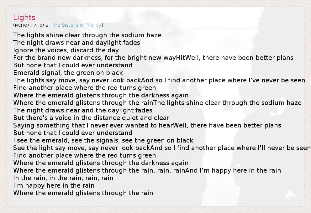 The lights shine clear through the sodium haze The night draws near and daylight fades Ignore the voices, discard the day For the brand new darkness, for the bright new wayHitWell, there have been better plans But none that I could ever understand Emerald signal, the green on black The lights say move, say never look backAnd so I find another place where I've never be seen Find another place where the red turns green Where the emerald glistens through the darkness again Where the emerald glistens through the rainThe lights shine clear through the sodium haze The night draws near and the daylight fades But there's a voice in the distance quiet and clear Saying something that I never ever wanted to hearWell, there have been better plans But none that I could ever understand I see the emerald, see the signals, see the green on black See the light say move, say never look backAnd so I find another place where I'll never be seen Find another place where the red turns green Where the emerald glistens through the darkness again Where the emerald glistens through the rain, rain, rainAnd I'm happy here in the rain In the rain, in the rain, rain, rain I'm happy here in the rain Where the emerald glistens through the rain