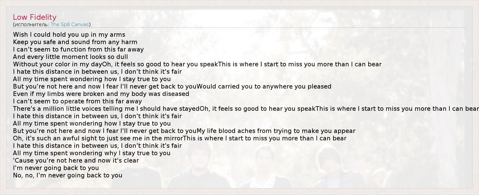 Wish I could hold you up in my arms Keep you safe and sound from any harm I can't seem to function from this far away And every little moment looks so dull Without your color in my dayOh, it feels so good to hear you speakThis is where I start to miss you more than I can bear I hate this distance in between us, I don't think it's fair All my time spent wondering how I stay true to you But you're not here and now I fear I'll never get back to youWould carried you to anywhere you pleased Even if my limbs were broken and my body was diseased I can't seem to operate from this far away There's a million little voices telling me I should have stayedOh, it feels so good to hear you speakThis is where I start to miss you more than I can bear I hate this distance in between us, I don't think it's fair All my time spent wondering how I stay true to you But you're not here and now I fear I'll never get back to youMy life blood aches from trying to make you appear Oh, it's such an awful sight to just see me in the mirrorThis is where I start to miss you more than I can bear I hate this distance in between us, I don't think it's fair All my time spent wondering why I stay true to you 'Cause you're not here and now it's clear I'm never going back to you No, no, I'm never going back to you