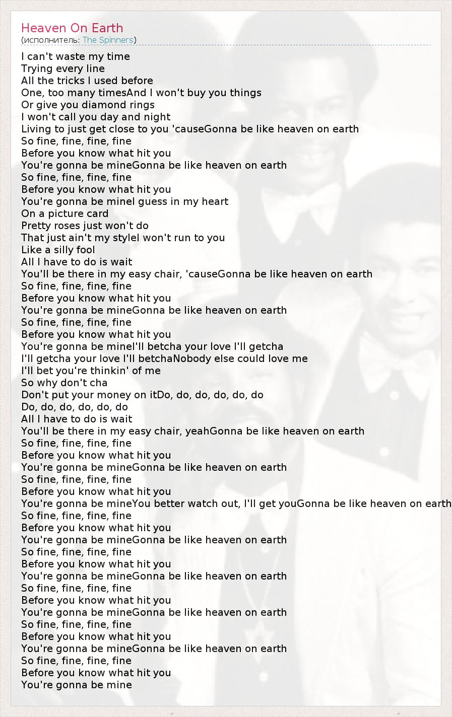 I can't waste my time Trying every line All the tricks I used before One, too many timesAnd I won't buy you things Or give you diamond rings I won't call you day and night Living to just get close to you 'causeGonna be like heaven on earth So fine, fine, fine, fine Before you know what hit you You're gonna be mineGonna be like heaven on earth So fine, fine, fine, fine Before you know what hit you You're gonna be mineI guess in my heart On a picture card Pretty roses just won't do That just ain't my styleI won't run to you Like a silly fool All I have to do is wait You'll be there in my easy chair, 'causeGonna be like heaven on earth So fine, fine, fine, fine Before you know what hit you You're gonna be mineGonna be like heaven on earth So fine, fine, fine, fine Before you know what hit you You're gonna be mineI'll betcha your love I'll getcha I'll getcha your love I'll betchaNobody else could love me I'll bet you're thinkin' of me So why don't cha Don't put your money on itDo, do, do, do, do, do Do, do, do, do, do, do All I have to do is wait You'll be there in my easy chair, yeahGonna be like heaven on earth So fine, fine, fine, fine Before you know what hit you You're gonna be mineGonna be like heaven on earth So fine, fine, fine, fine Before you know what hit you You're gonna be mineYou better watch out, I'll get youGonna be like heaven on earth So fine, fine, fine, fine Before you know what hit you You're gonna be mineGonna be like heaven on earth So fine, fine, fine, fine Before you know what hit you You're gonna be mineGonna be like heaven on earth So fine, fine, fine, fine Before you know what hit you You're gonna be mineGonna be like heaven on earth So fine, fine, fine, fine Before you know what hit you You're gonna be mineGonna be like heaven on earth So fine, fine, fine, fine Before you know what hit you You're gonna be mine