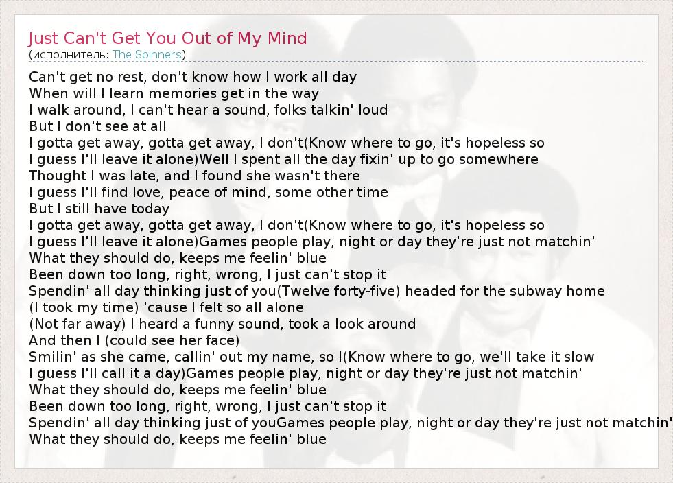 А как ты думаешь, о чем песня "Just Can't Get You Out of My Mind" ?