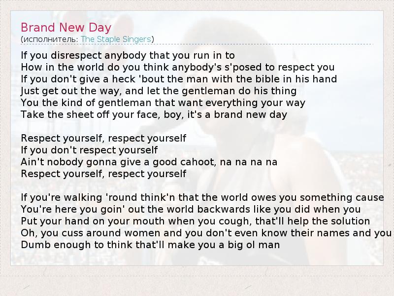 If you disrespect anybody that you run in to How in the world do you think anybody's s'posed to respect you If you don't give a heck 'bout the man with the bible in his hand Just get out the way, and let the gentleman do his thing You the kind of gentleman that want everything your way Take the sheet off your face, boy, it's a brand new day Respect yourself, respect yourself If you don't respect yourself Ain't nobody gonna give a good cahoot, na na na na Respect yourself, respect yourself If you're walking 'round think'n that the world owes you something cause You're here you goin' out the world backwards like you did when you Put your hand on your mouth when you cough, that'll help the solution Oh, you cuss around women and you don't even know their names and you Dumb enough to think that'll make you a big ol man