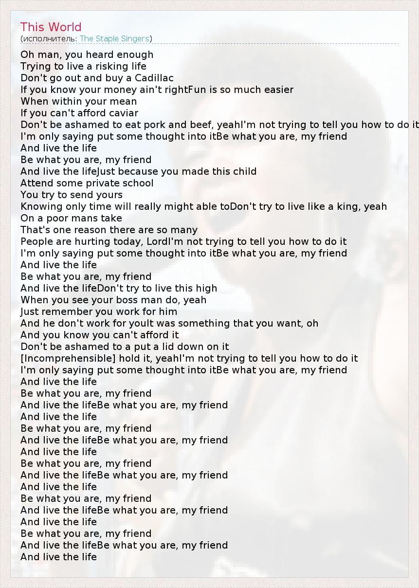 Oh man, you heard enough Trying to live a risking life Don't go out and buy a Cadillac If you know your money ain't rightFun is so much easier When within your mean If you can't afford caviar Don't be ashamed to eat pork and beef, yeahI'm not trying to tell you how to do it I'm only saying put some thought into itBe what you are, my friend And live the life Be what you are, my friend And live the lifeJust because you made this child Attend some private school You try to send yours Knowing only time will really might able toDon't try to live like a king, yeah On a poor mans take That's one reason there are so many People are hurting today, LordI'm not trying to tell you how to do it I'm only saying put some thought into itBe what you are, my friend And live the life Be what you are, my friend And live the lifeDon't try to live this high When you see your boss man do, yeah Just remember you work for him And he don't work for youIt was something that you want, oh And you know you can't afford it Don't be ashamed to a put a lid down on it [Incomprehensible] hold it, yeahI'm not trying to tell you how to do it I'm only saying put some thought into itBe what you are, my friend And live the life Be what you are, my friend And live the lifeBe what you are, my friend And live the life Be what you are, my friend And live the lifeBe what you are, my friend And live the life Be what you are, my friend And live the lifeBe what you are, my friend And live the life Be what you are, my friend And live the lifeBe what you are, my friend And live the life Be what you are, my friend And live the lifeBe what you are, my friend And live the life