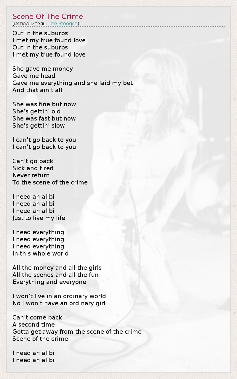 Out in the suburbs I met my true found love Out in the suburbs I met my true found love She gave me money Gave me head Gave me everything and she laid my bet And that ain't all She was fine but now She's gettin' old She was fast but now She's gettin' slow I can't go back to you I can't go back to you Can't go back Sick and tired Never return To the scene of the crime I need an alibi I need an alibi I need an alibi Just to live my life I need everything I need everything I need everything In this whole world All the money and all the girls All the scenes and all the fun Everything and everyone I won't live in an ordinary world No I won't have an ordinary girl Can't come back A second time Gotta get away from the scene of the crime Scene of the crime I need an alibi I need an alibi