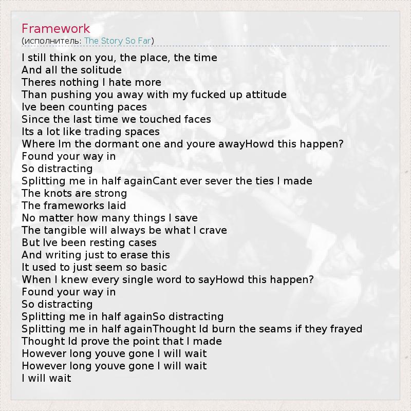 I still think on you, the place, the time And all the solitude Theres nothing I hate more Than pushing you away with my fucked up attitude Ive been counting paces Since the last time we touched faces Its a lot like trading spaces Where Im the dormant one and youre awayHowd this happen? Found your way in So distracting Splitting me in half againCant ever sever the ties I made The knots are strong The frameworks laid No matter how many things I save The tangible will always be what I crave But Ive been resting cases And writing just to erase this It used to just seem so basic When I knew every single word to sayHowd this happen? Found your way in So distracting Splitting me in half againSo distracting Splitting me in half againThought Id burn the seams if they frayed Thought Id prove the point that I made However long youve gone I will wait However long youve gone I will wait I will wait