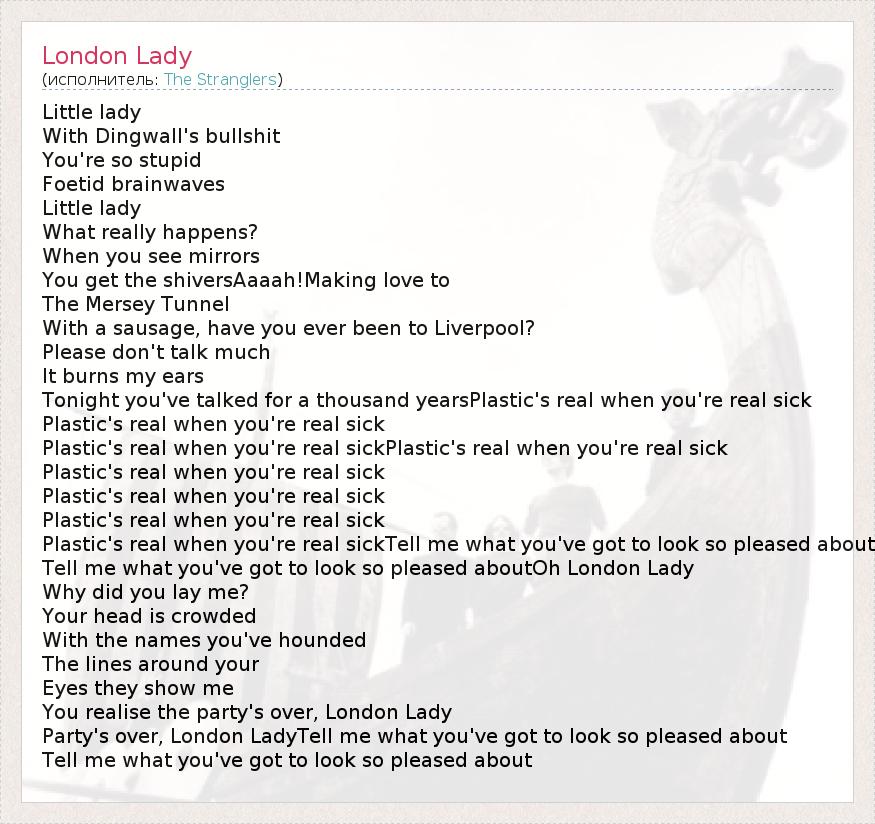 Little lady With Dingwall's bullshit You're so stupid Foetid brainwaves Little lady What really happens? When you see mirrors You get the shiversAaaah!Making love to The Mersey Tunnel With a sausage, have you ever been to Liverpool? Please don't talk much It burns my ears Tonight you've talked for a thousand yearsPlastic's real when you're real sick Plastic's real when you're real sick Plastic's real when you're real sickPlastic's real when you're real sick Plastic's real when you're real sick Plastic's real when you're real sick Plastic's real when you're real sick Plastic's real when you're real sickTell me what you've got to look so pleased about Tell me what you've got to look so pleased aboutOh London Lady Why did you lay me? Your head is crowded With the names you've hounded The lines around your Eyes they show me You realise the party's over, London Lady Party's over, London LadyTell me what you've got to look so pleased about Tell me what you've got to look so pleased about